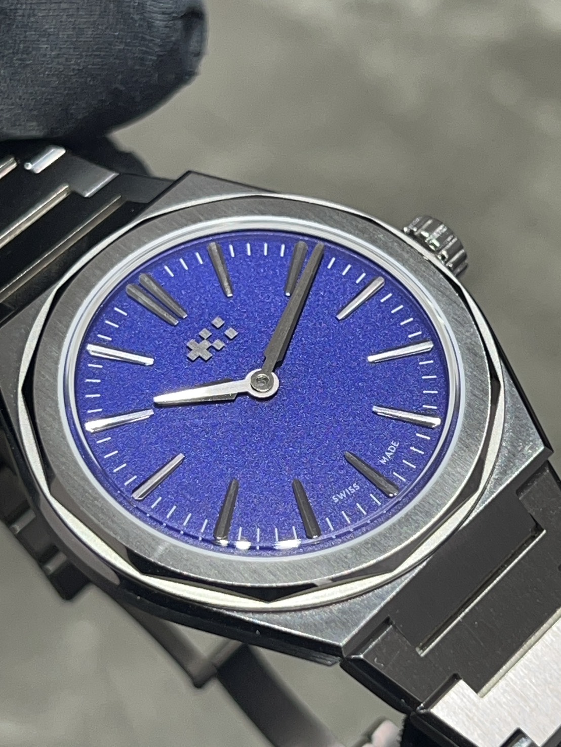 文字盤はマットで粒状感のある(グレイン仕上げ)質感の落ち着いたトーンのパープルがかったディープブルーとなっており二針の大変すっきりした装飾となっております。