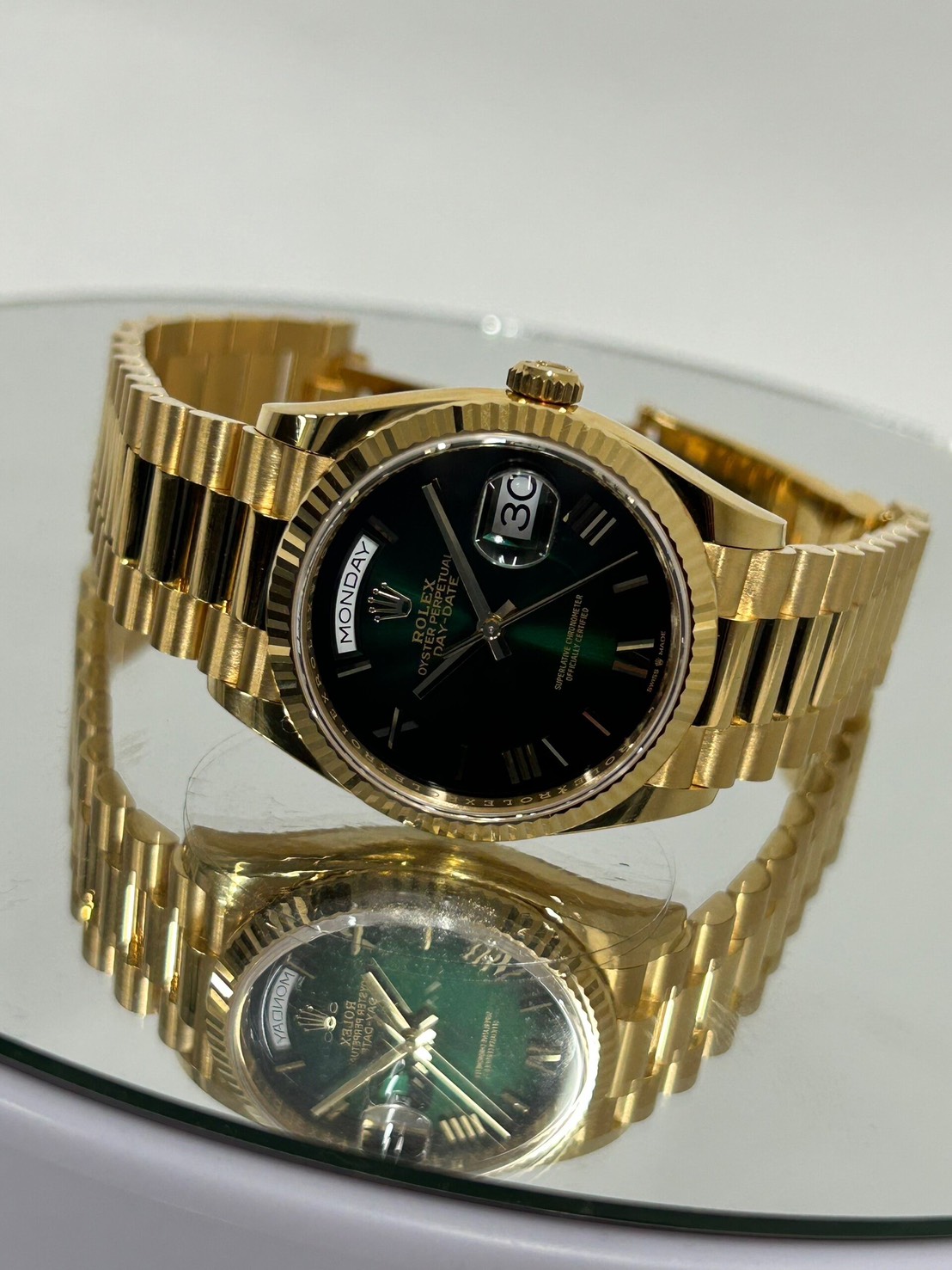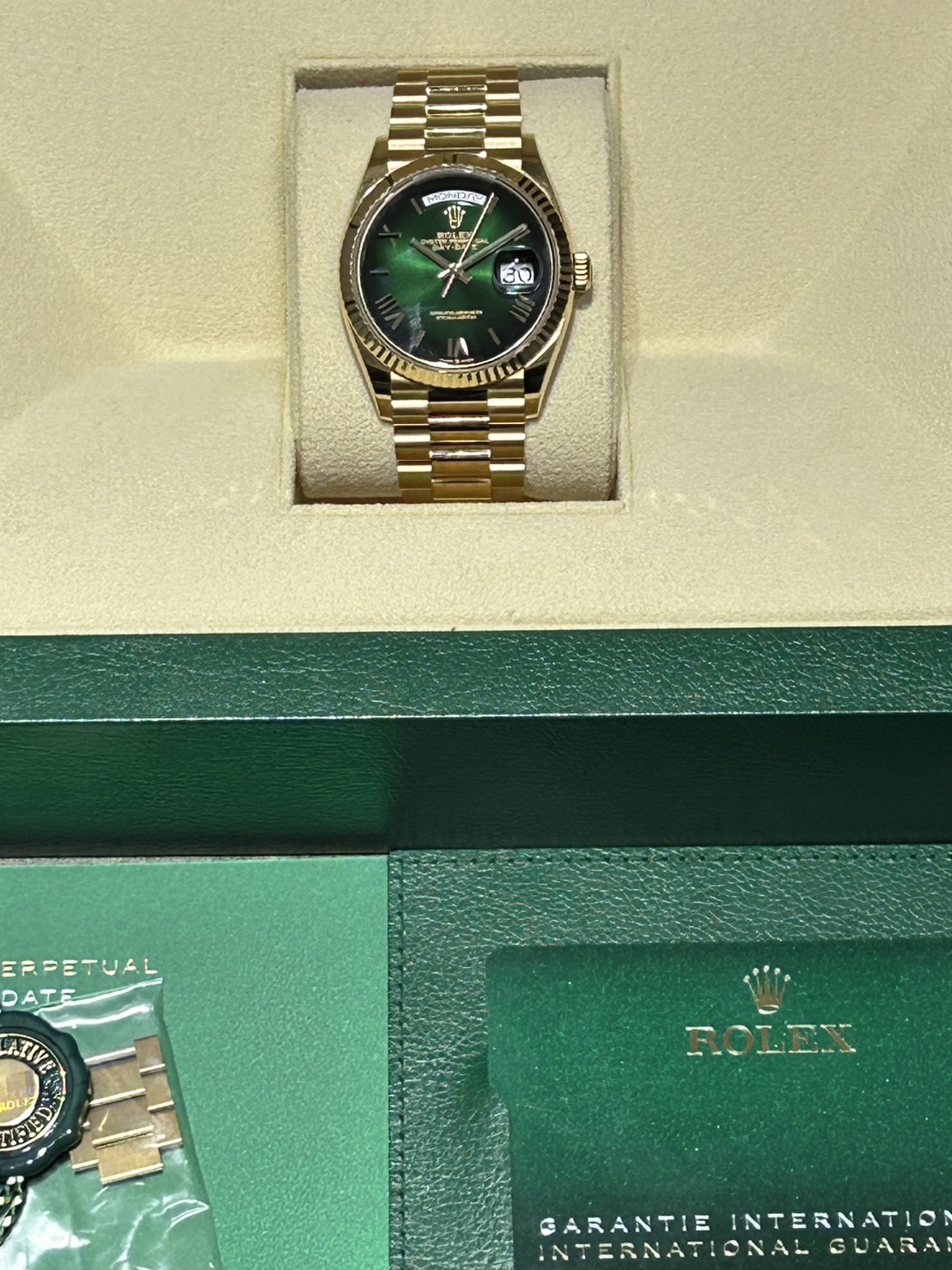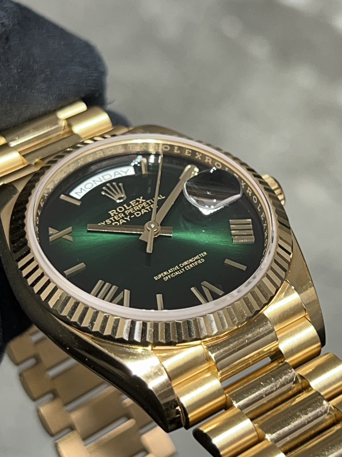 今回はロレックスのコーポレートカラーでもあるグリーンオンブレダイヤルのデイデイトが入荷致しました。