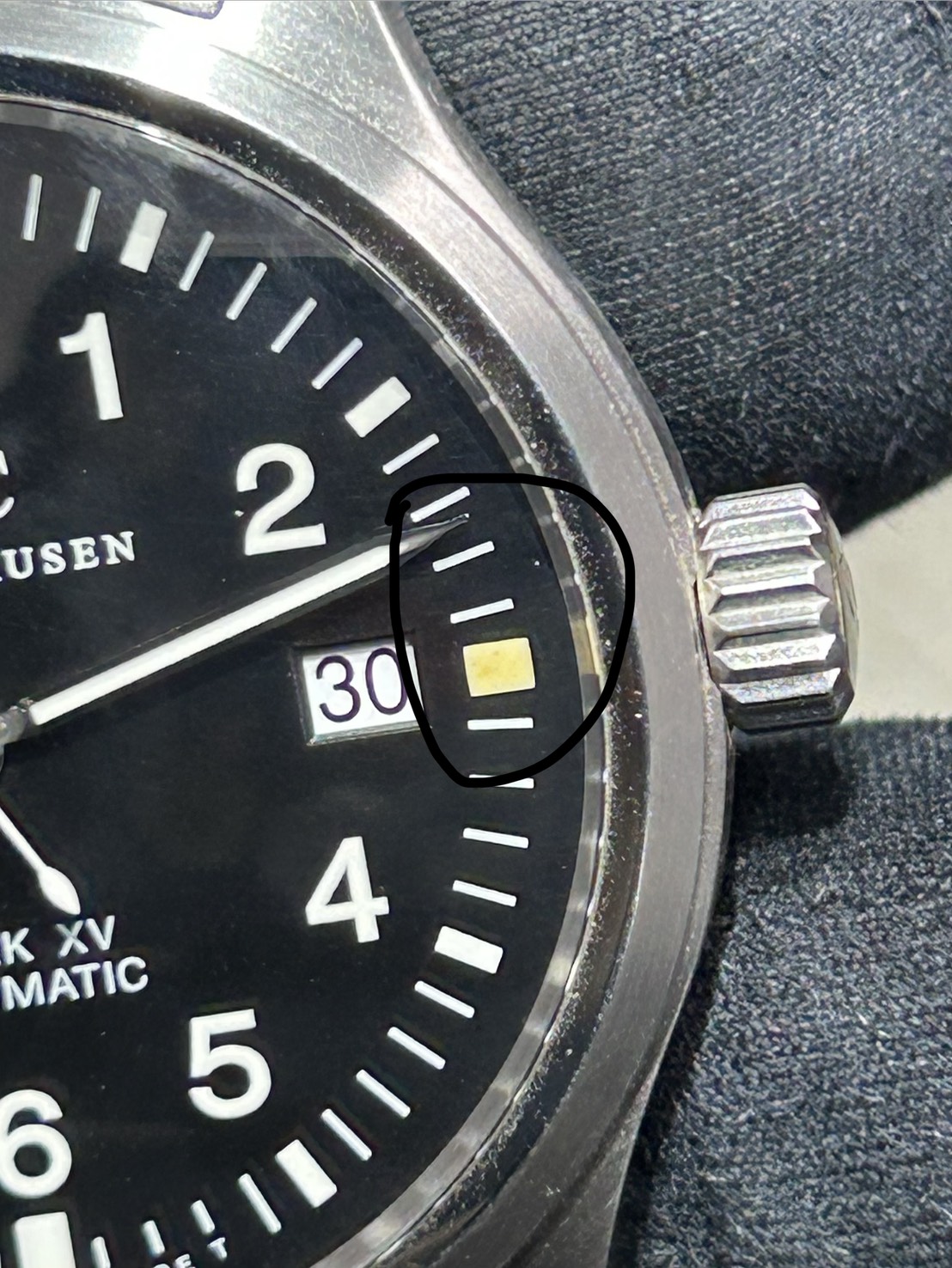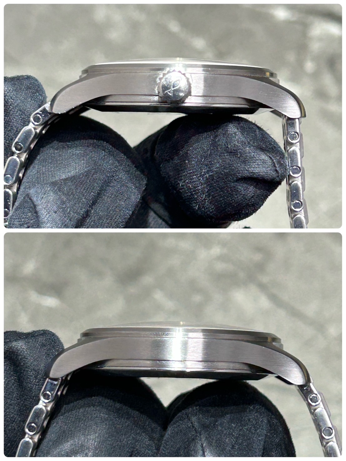 ご愛用に伴うスレが全体的にあり、肉眼では分かりませんがガラス4時位置にスレがあり、5時側11時側ベゼルに小傷がございます。年式を考えると目立った傷は少ない印象です。3時位置夜光部分だけ焼けております。