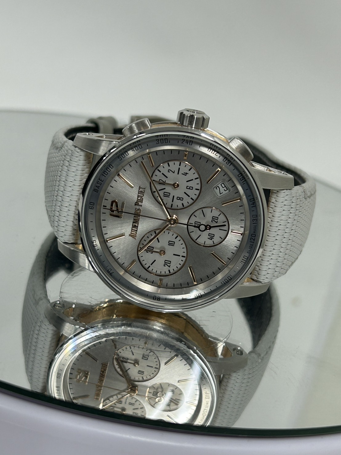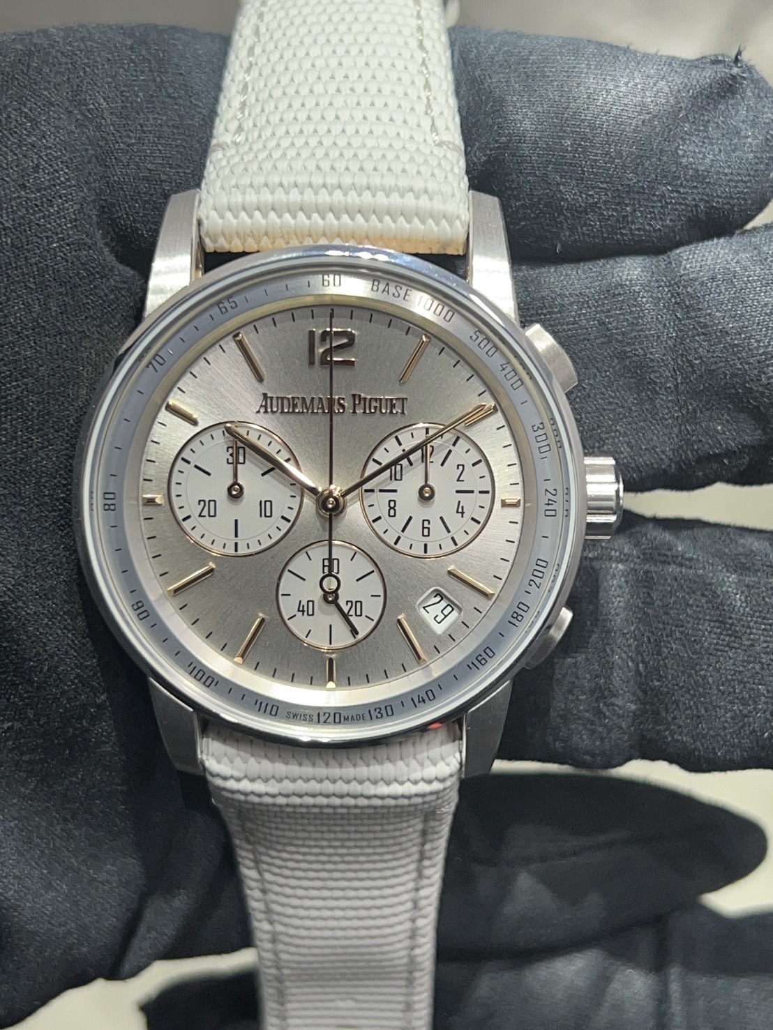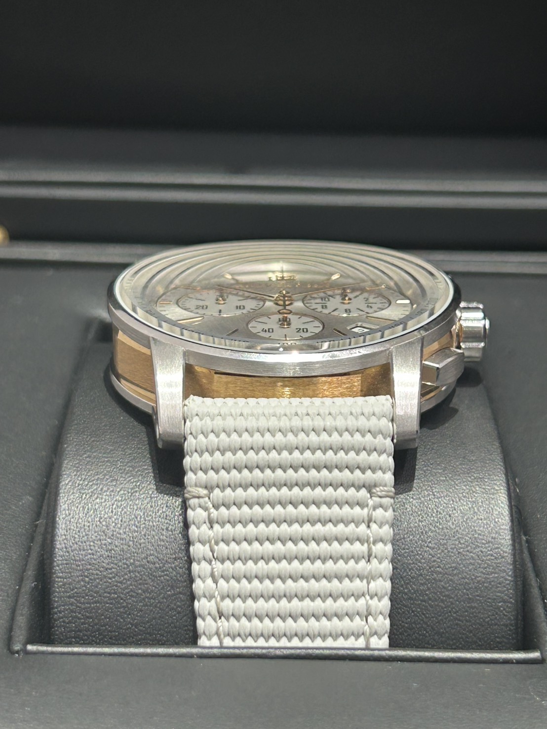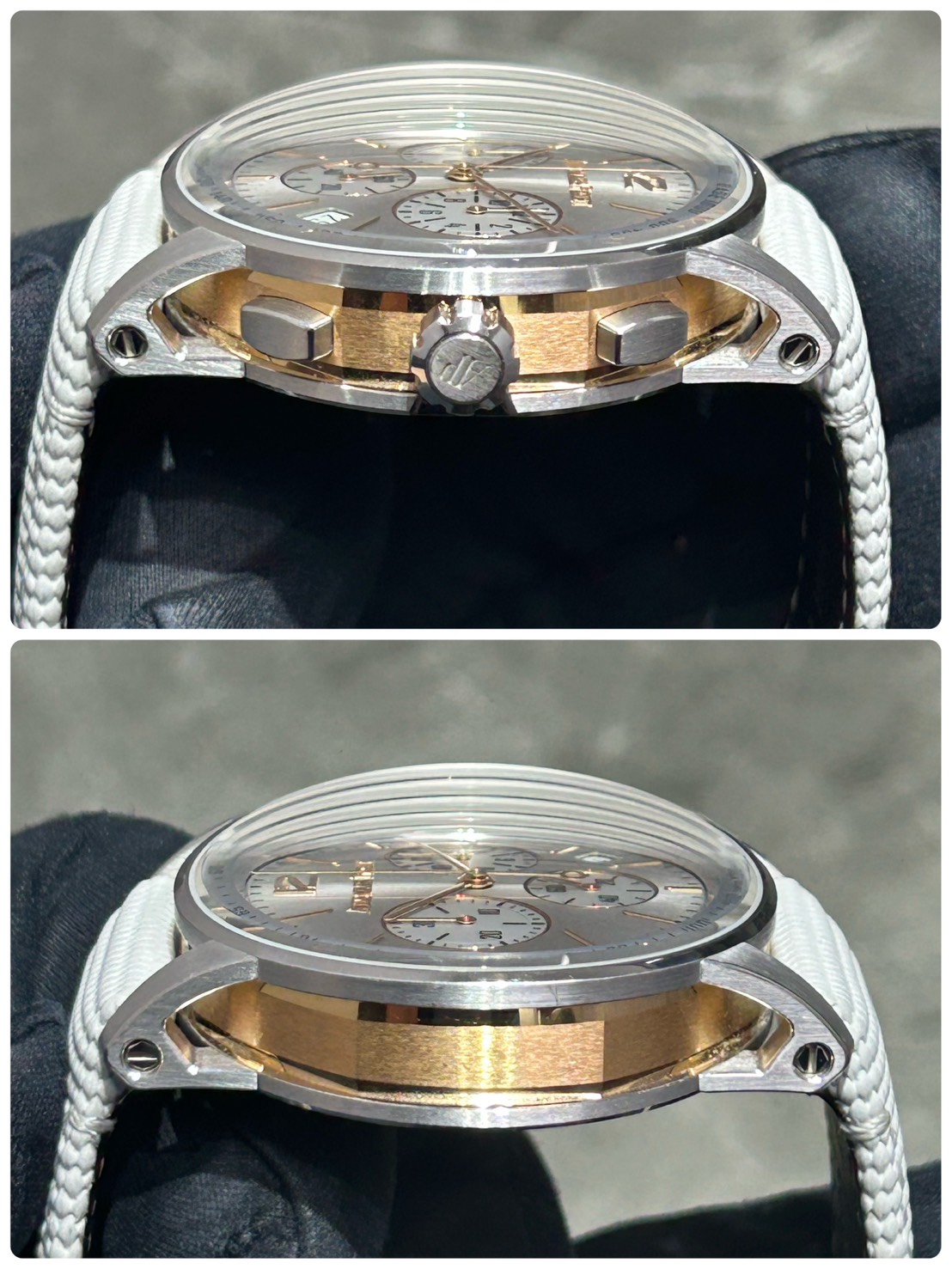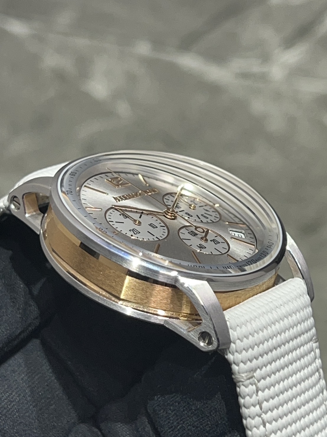 こちらのモデルは18Kホワイトゴールドとピンクゴールドのツートーンケースに、サンバーストのグレーラッカーダイヤル。ピンクゴールドのインデックスと光が混じり色気のある輝きを放ちます。
