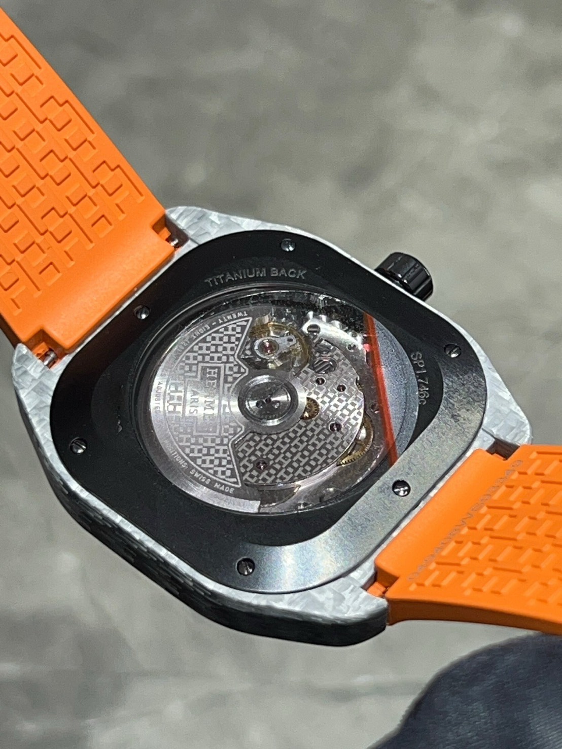 シースルーの裏蓋からはパルミジャーニフルリエのCal.3002ベースのCal.H1837が確認できます。