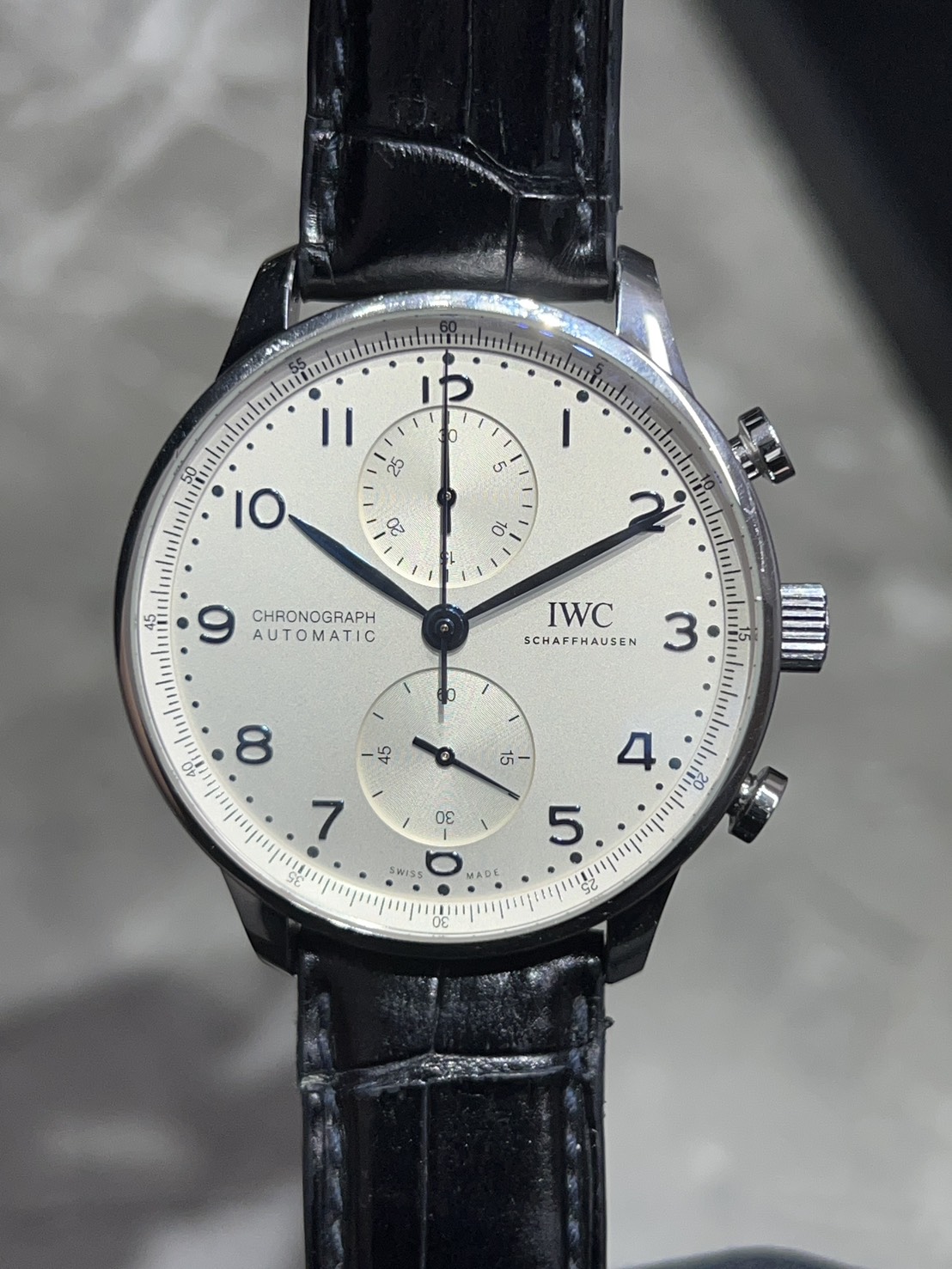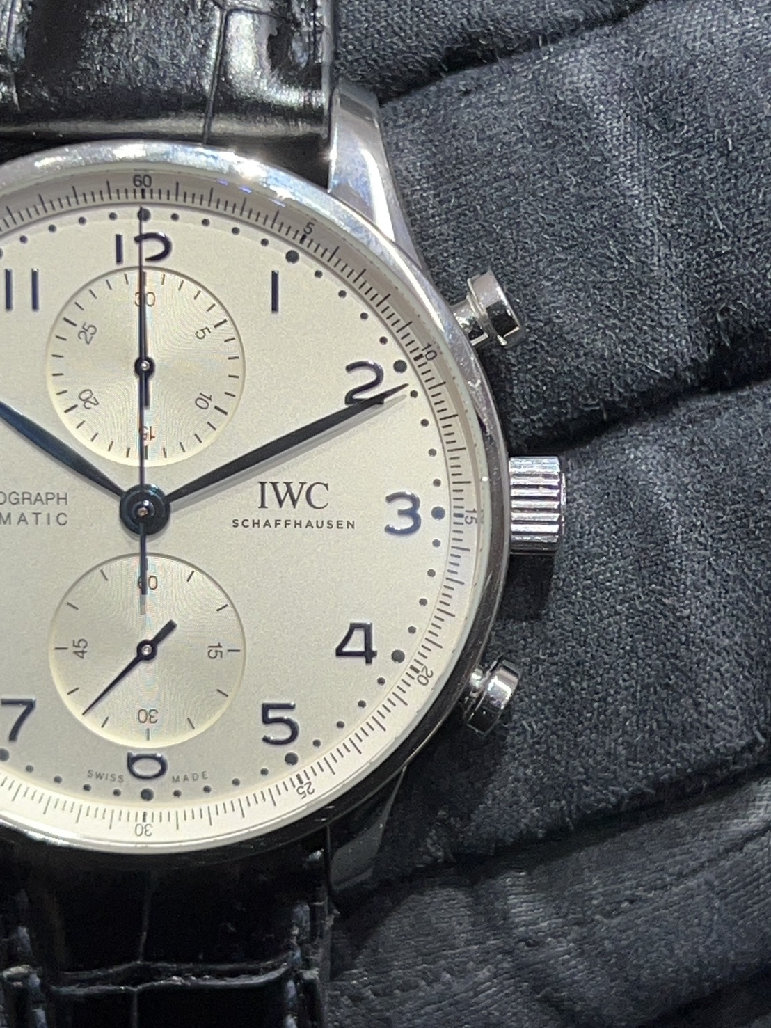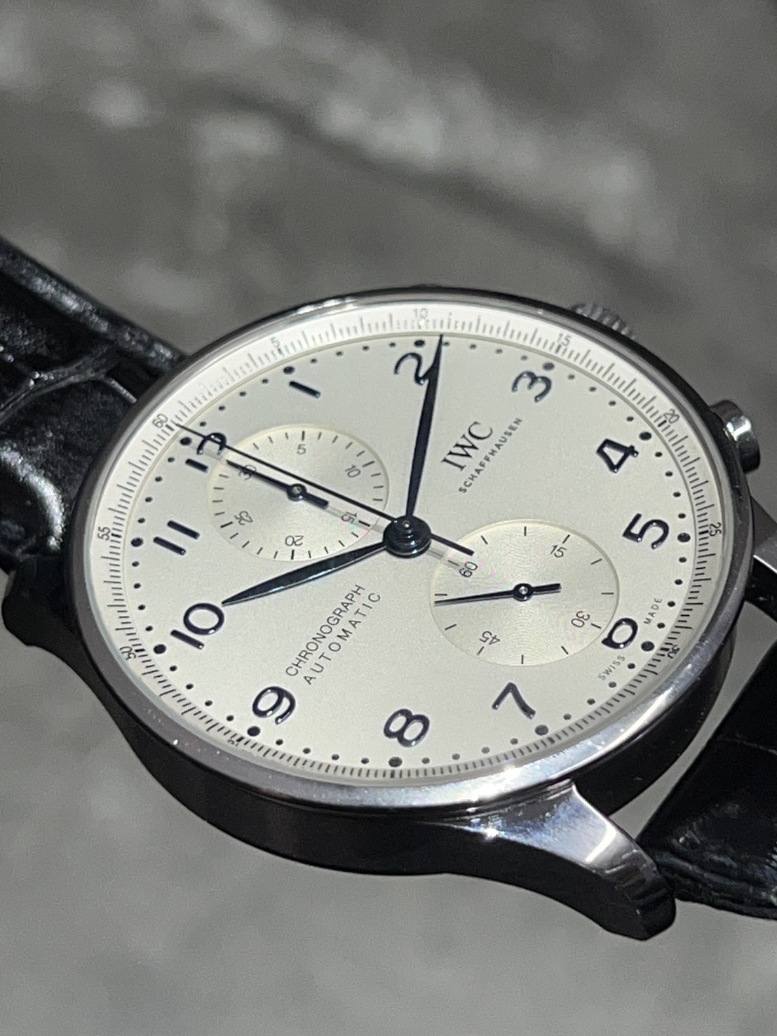 スイスの時計ブランド「IWC」の、エレガンスとスポーティさを融合させた人気腕時計コレクションのポルトギーゼクロノグラフでございます。