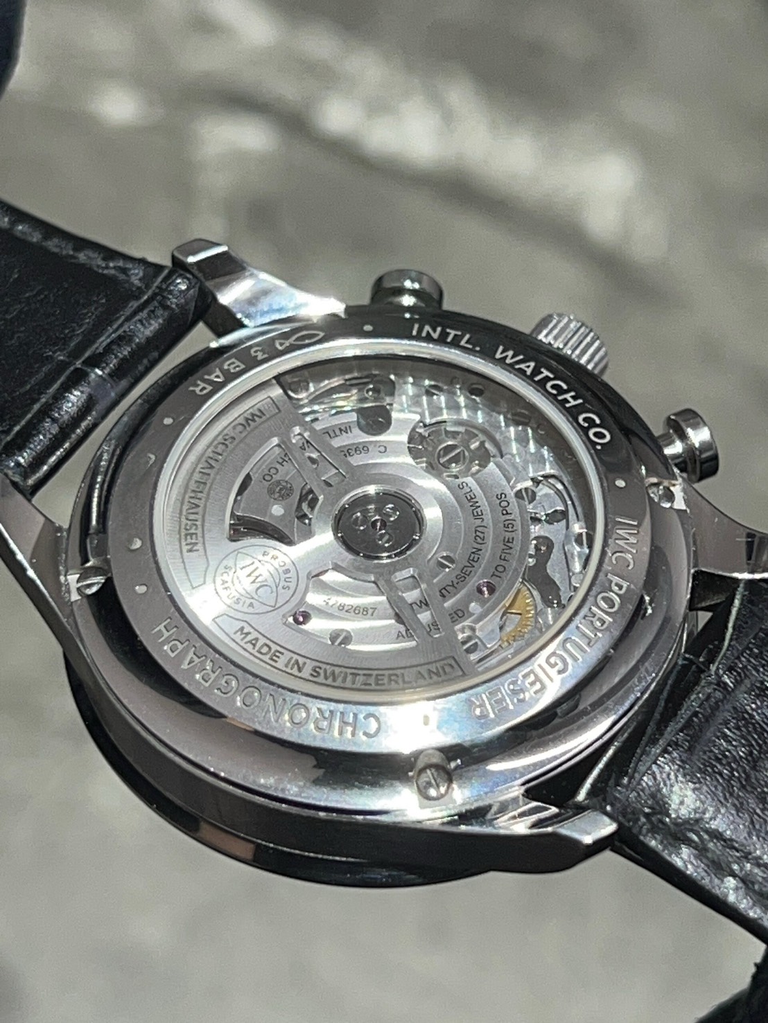 裏蓋からはスタイリッシュなIWC自社製キャリバー69355がご覧頂けます。中古品でございますので自社機芯のクラシッククロノがお求めやすい価格で手に入るのもIWCファンにとって大きな魅力だと思います。