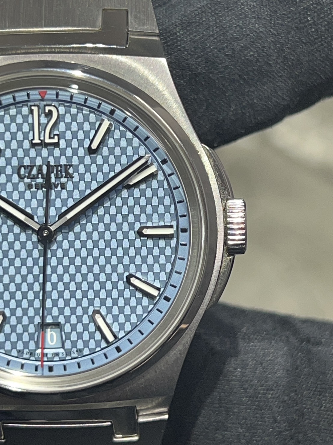 特徴としては文字盤のトラペゾイド(台形)パターンのギョーシェや針先端のレッド、裏蓋から広がるメカニカルなプラチナ製マイクロローターを備えたSXH5、そしてブランドの頭文字を型取ったポリッシュ仕上げのC等見どころがたくさんあるモデルでございます。