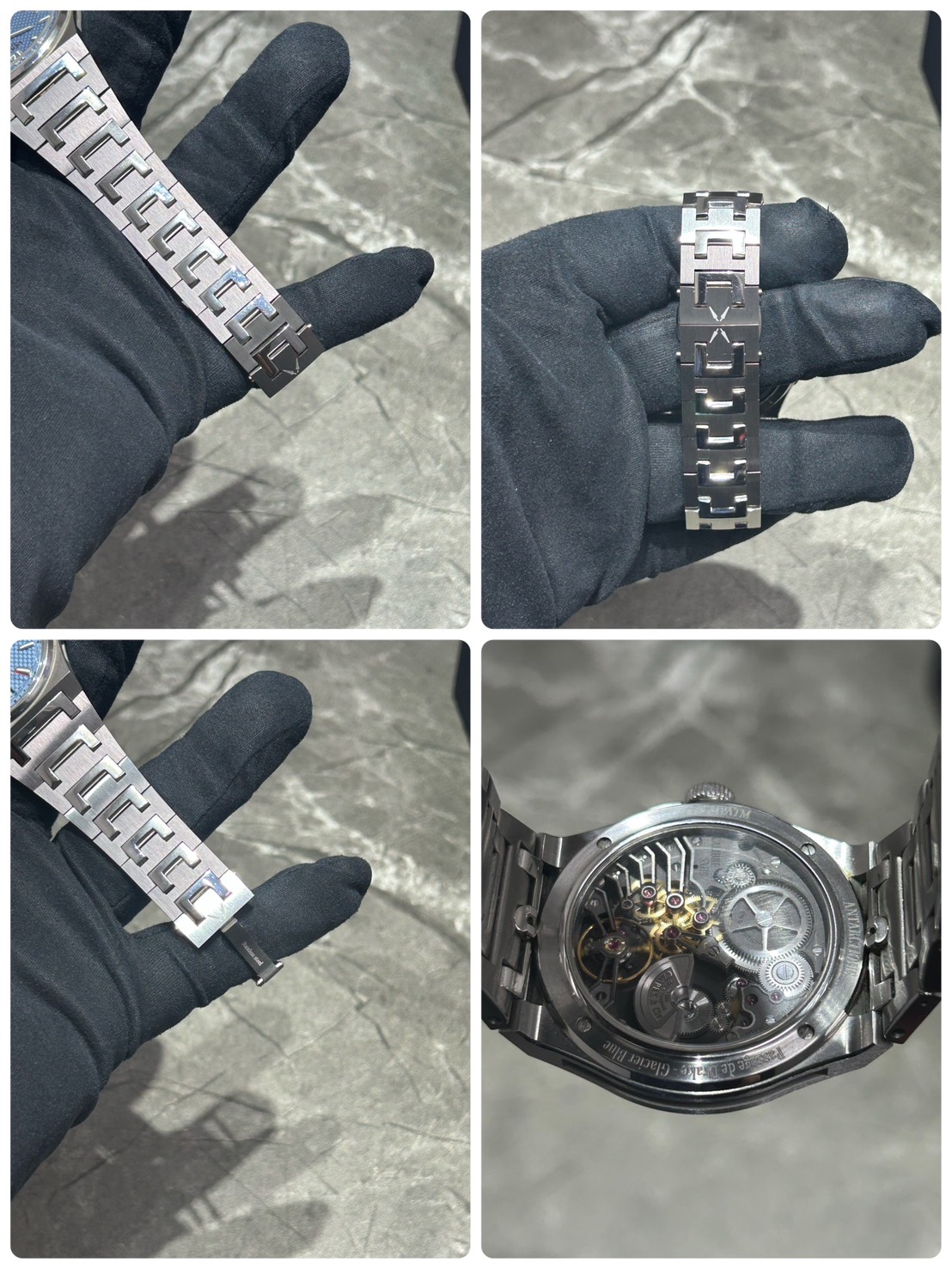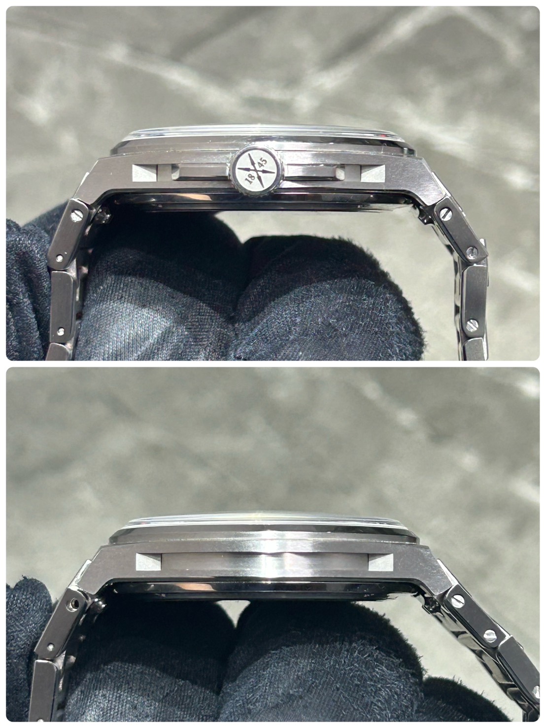 推しポイントとしてトラペゾイド(台形)パターンが生み出す光と影、表情の変化が美しい点とブレスのCが拾う光の移動、ラグジュアリースポーツウオッチとして申し分がなく更に専用工具でご自身でブレスからラバーストラップに変更可能で気分や場面によって交換が可能のスタイリッシュなモデルでございます。