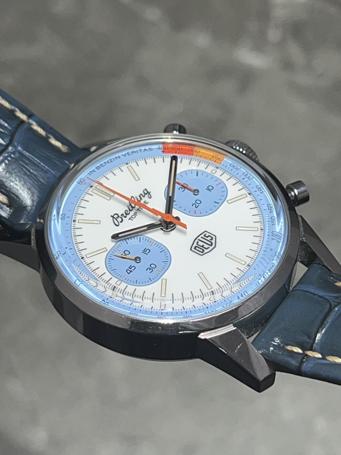 推しポイントとしてダイヤルが爽やかでポップ、記憶に残るダイヤルデザインで白いラッカーダイヤルにライトブルー(スカイブルー/ターコイズ)のグラデーションが美しく稲妻型のクロノグラフ秒針がスタイリッシュでございます。