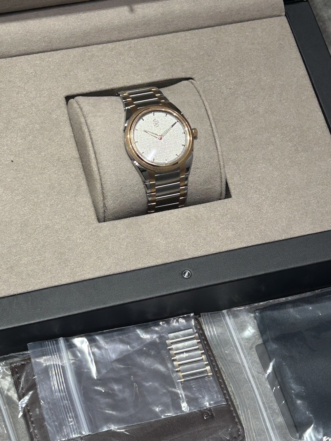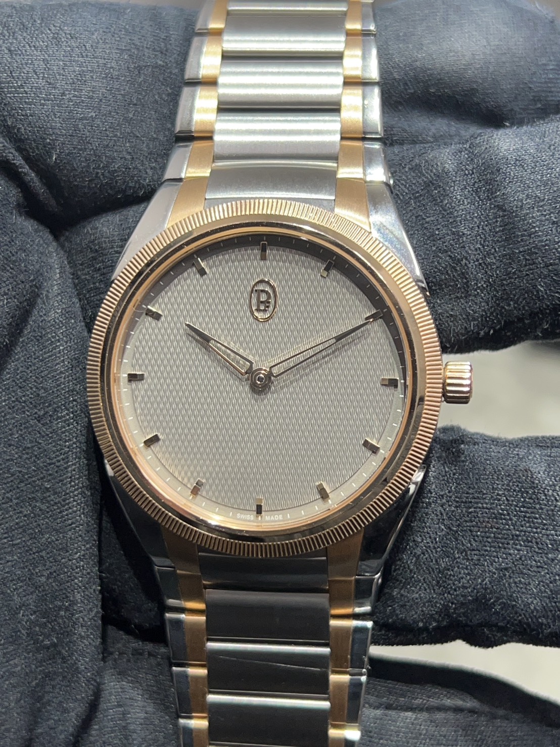 2023年新作、ギョーシェが施されたサンドグレー文字盤にステンレスと18Kローズゴールドのコンビケース&ブレスレットが特徴的なラグジュアリードレスウォッチの36㎜径のトンダPFが入荷致しました。