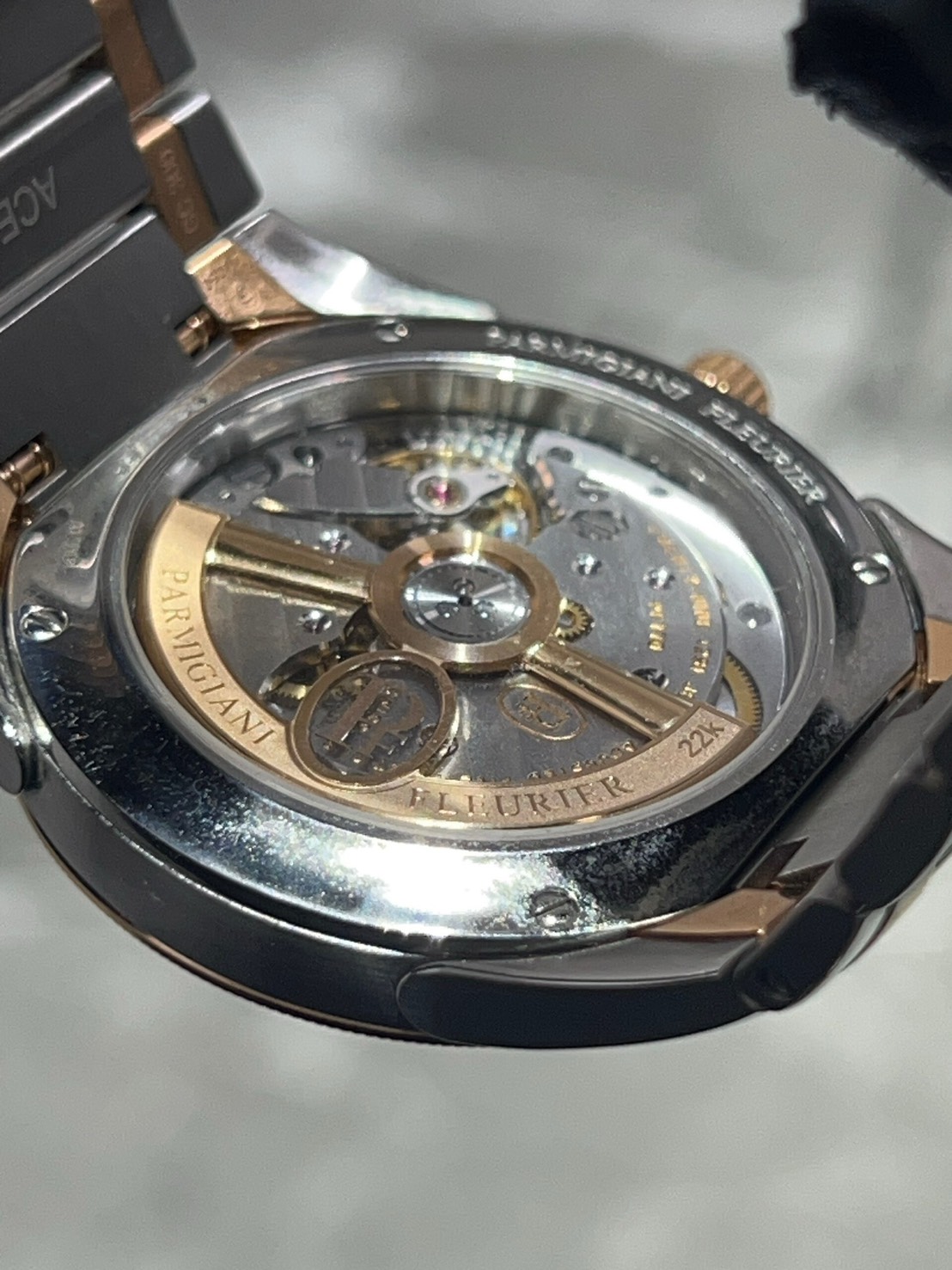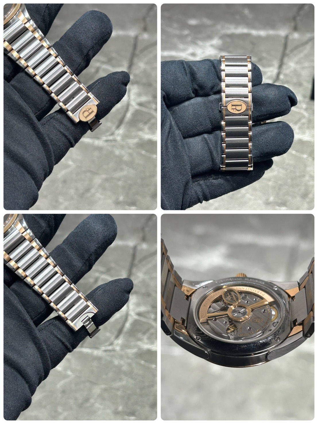 裏蓋からは自社ムーブメントCal.PF770に22Kのゴールドローター、シースルーバックから眺められる美しい機構、100m防水など、見た目の美しさだけでなく実用性と機械的な魅力も兼ね備えています。