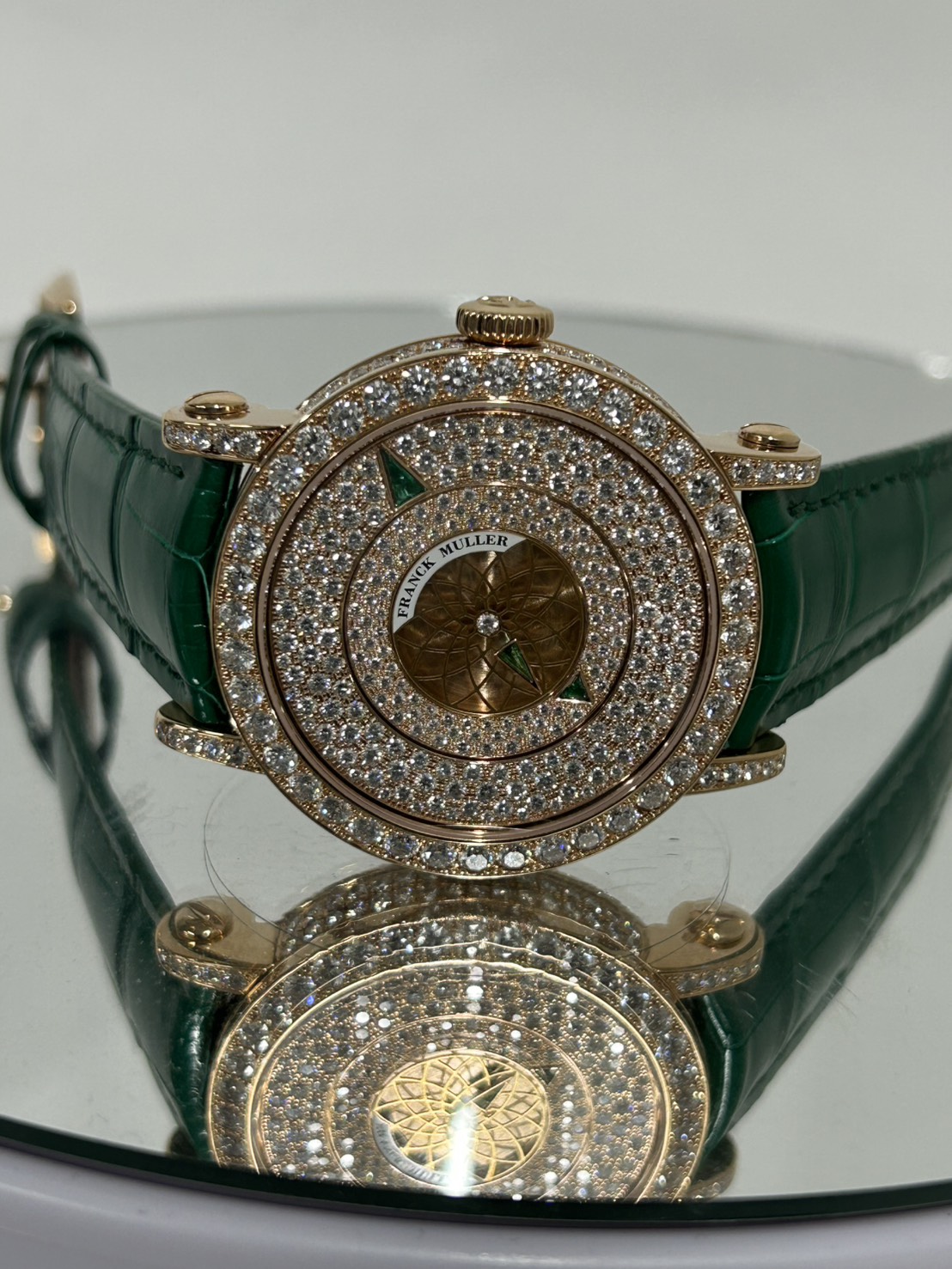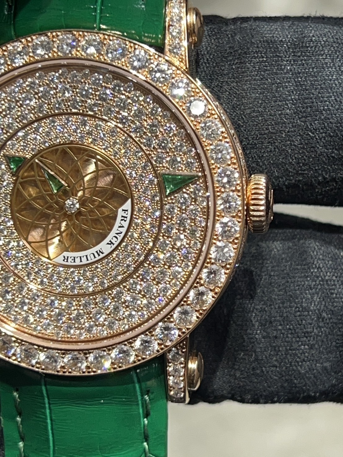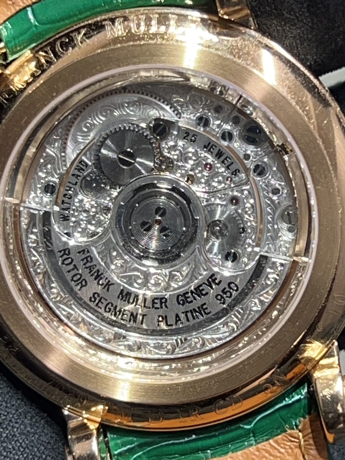 時・分・秒の3枚の独立した回転ディスクが、まるで手のないまま時間だけが空中を舞っているように見えるミステリー表示、まさしくフランクミュラーの「時間は自由で神秘的」という哲学を体現したアートピースでございます。