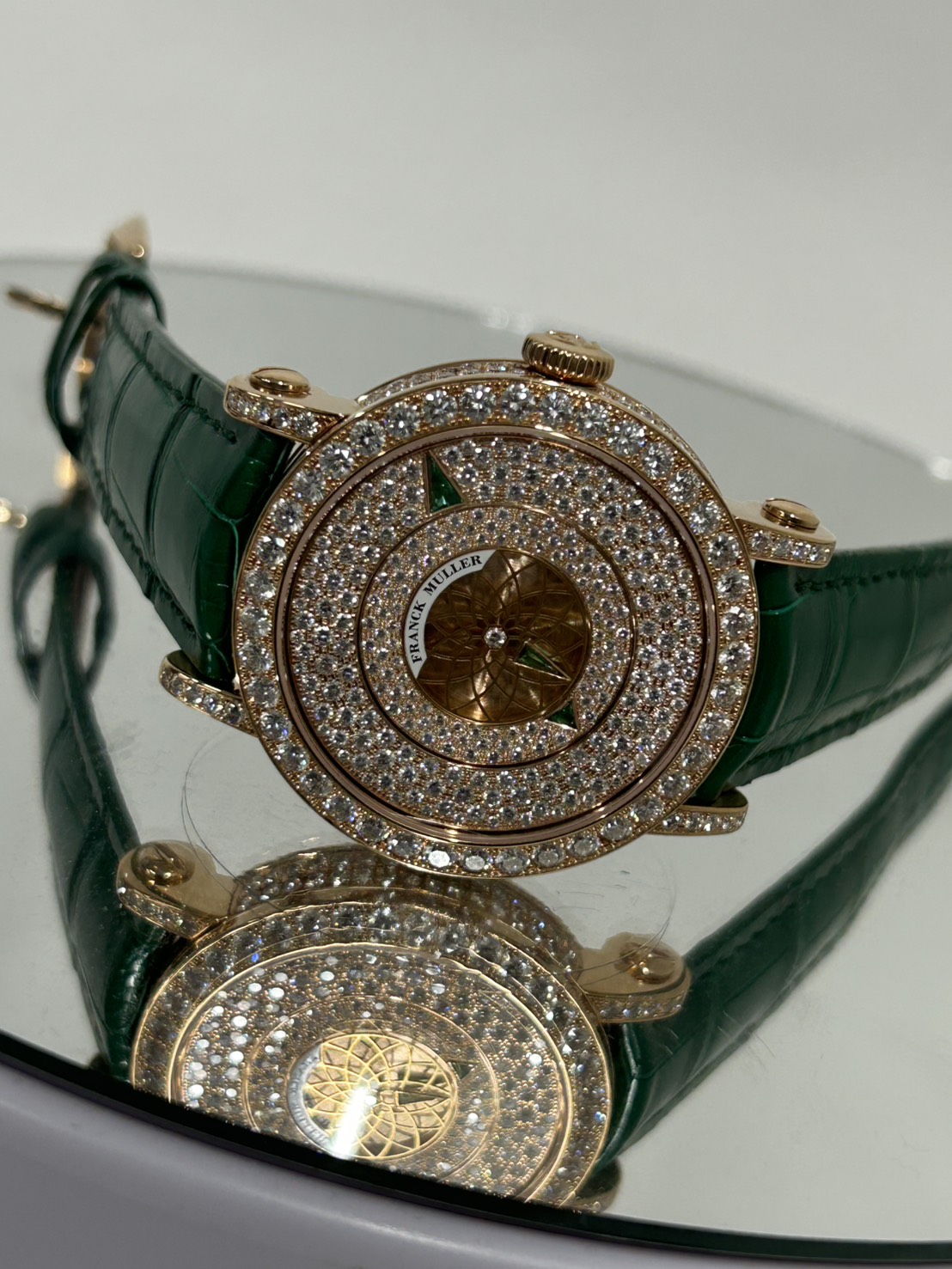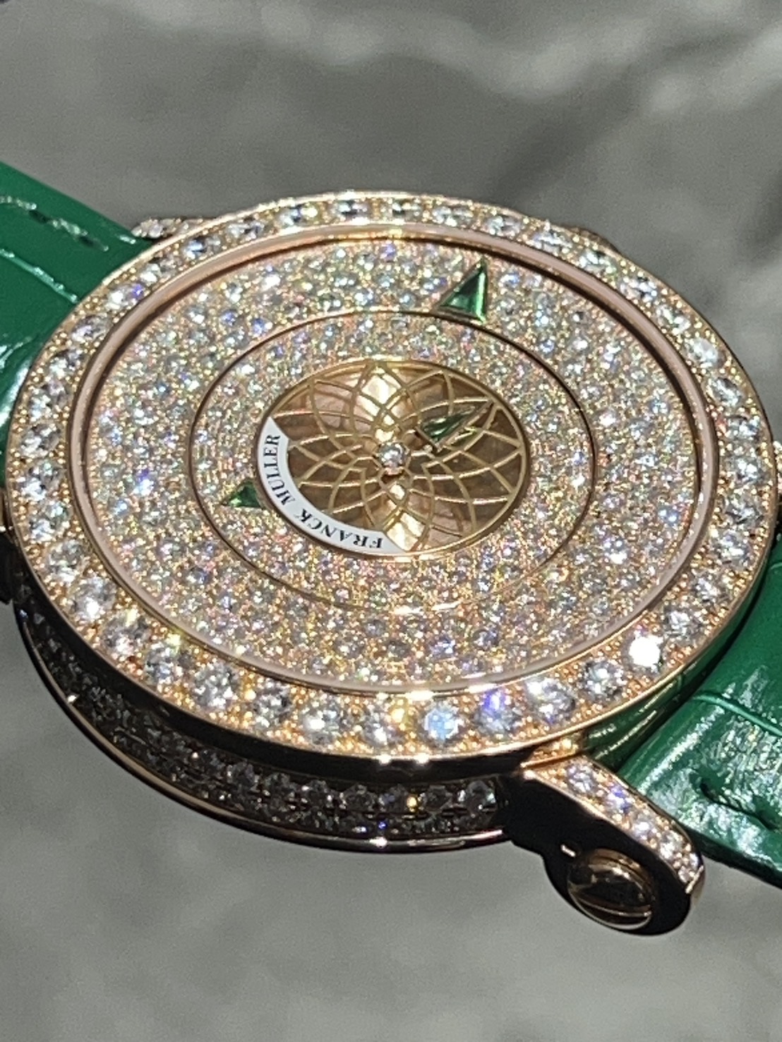 2025年に発表された比較的新しいモデルのトリプルミステリー、こちらは時間表示を従来の針ではなく3つの回転ディスク(時・分・秒)で表現する革新的なデザインが最大の魅力の全体が宝石で覆われたようなラグジュアリー感あふれるモデルでございます。