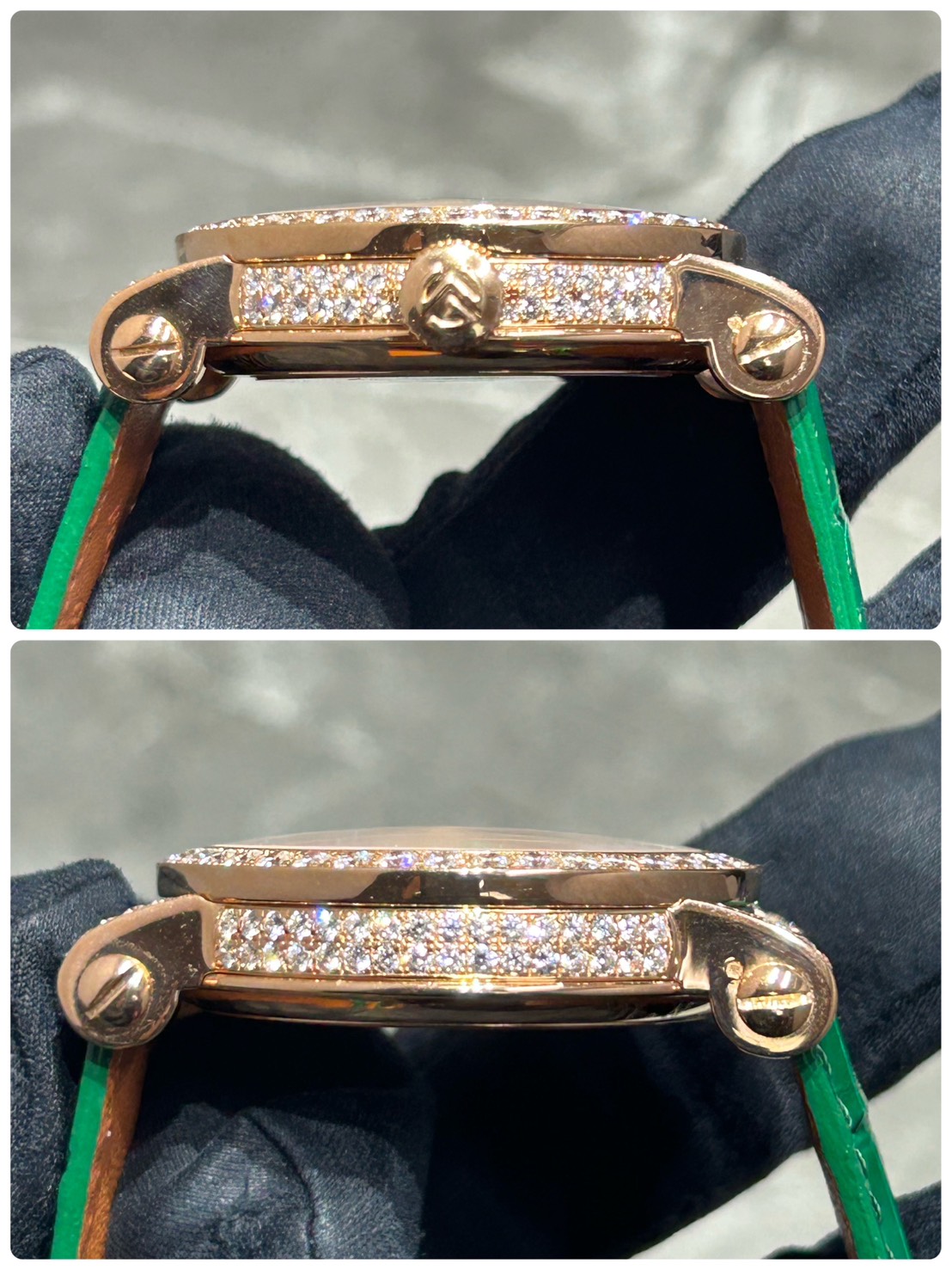 ケース、ベゼル、文字盤には全面にダイヤモンドがセットされ、総数357石 約5.86ctとブリリアントカットされたダイヤがローズゴールドのケースの輝きと合わさって眩い輝きとなっております。