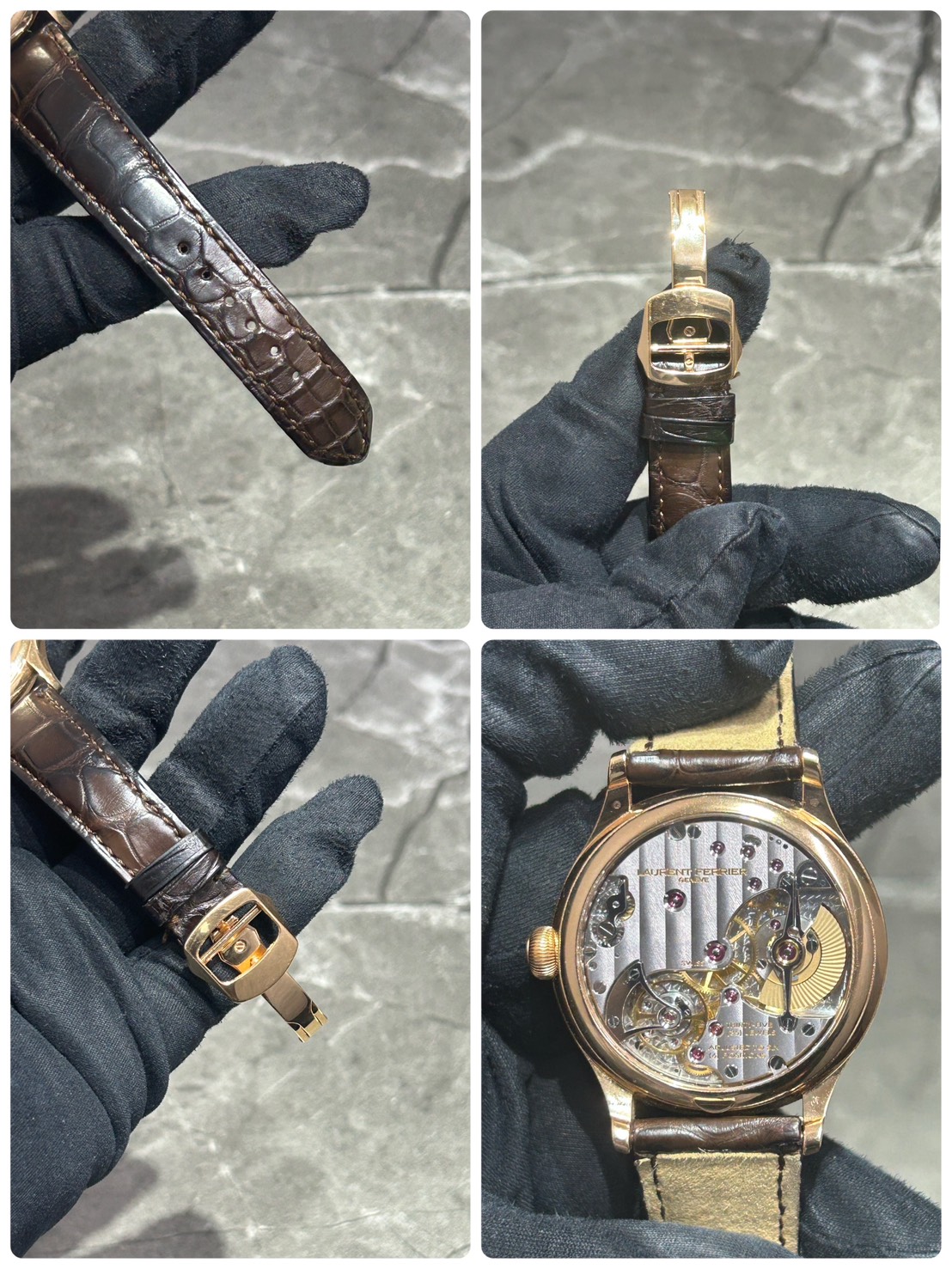 文字盤はバーチカル(縦)サテンブラッシュ仕上げのシルバーダイヤル、繊細な仕上げのレッドゴールド製の針、インデックスとのコントラストも絶妙で大変美しい装飾となっております。