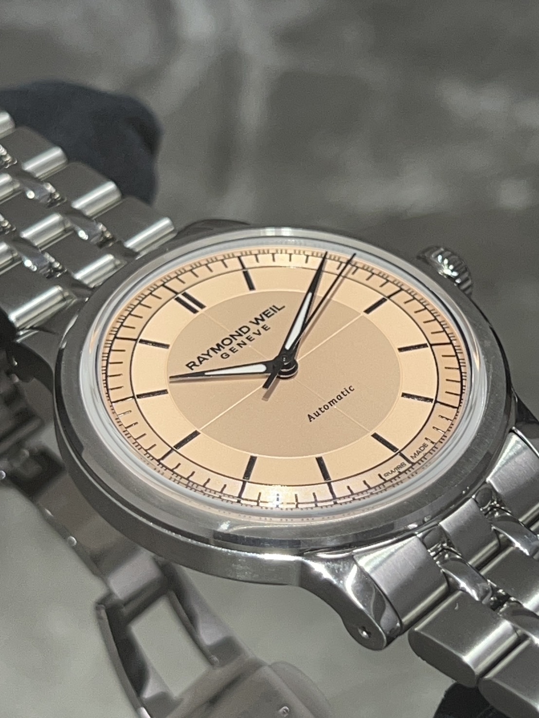 推しポイントとして光の角度により表情が変化し、ピンクがかった暖かみのある色味が柔らかく、上品なセクターダイアルが最高にエレガントでございます。