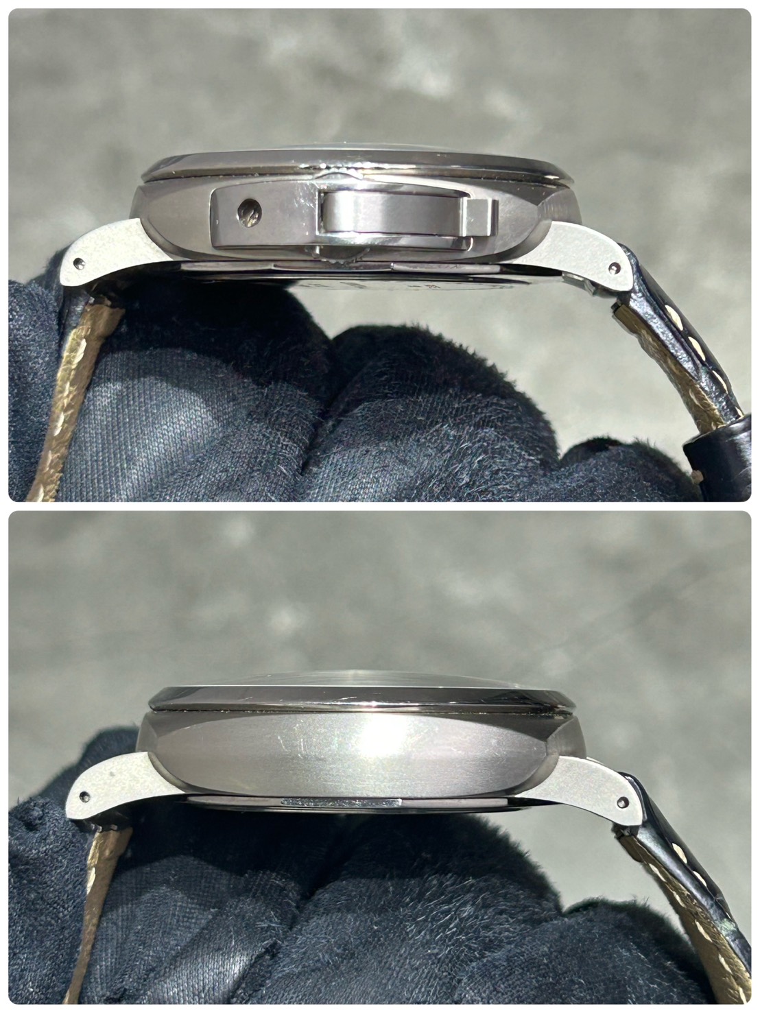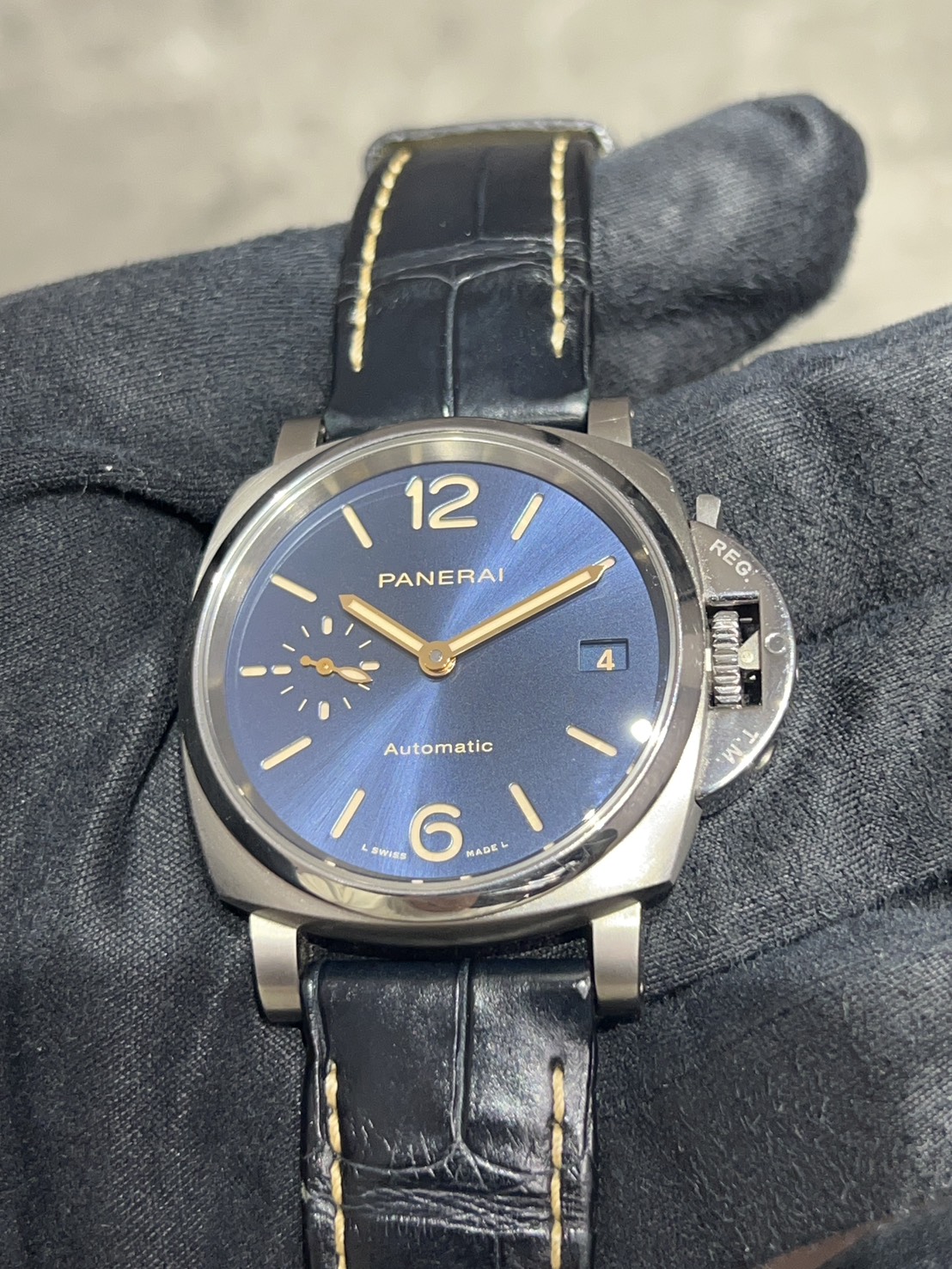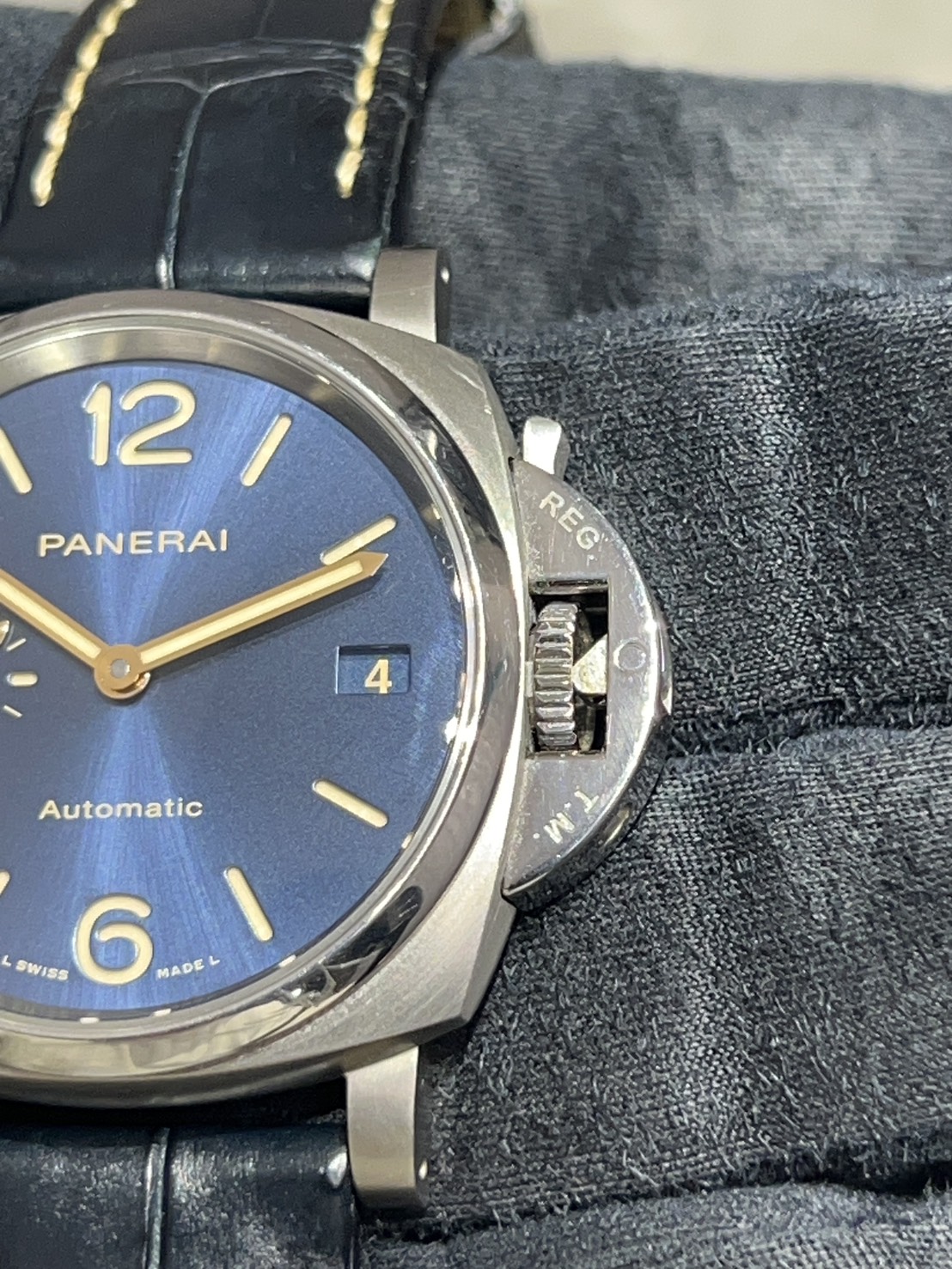 推しポイントとしてパネライのイメージを覆すような「軽くて薄い」モデルで38㎜ケースに厚みが11.50㎜、パネライ史上最も軽く薄いクラスと言われ男女共にご愛用頂けるモデルで袖口にスッと入る軽やかさが魅力的でございます。