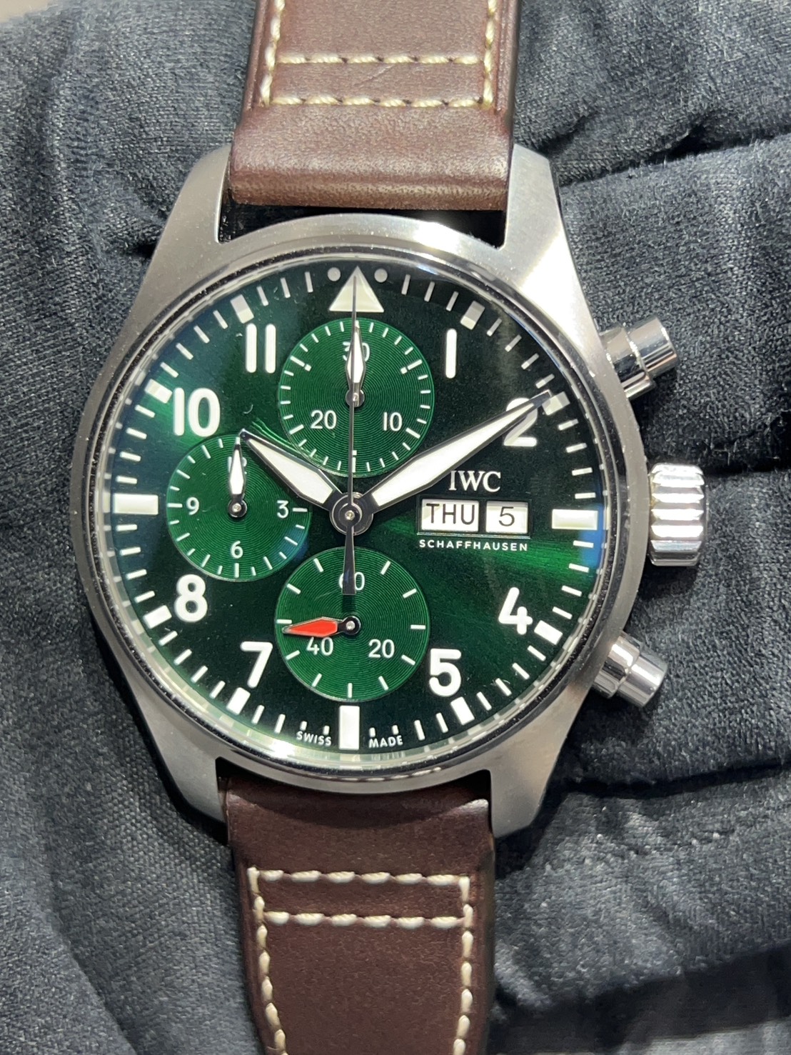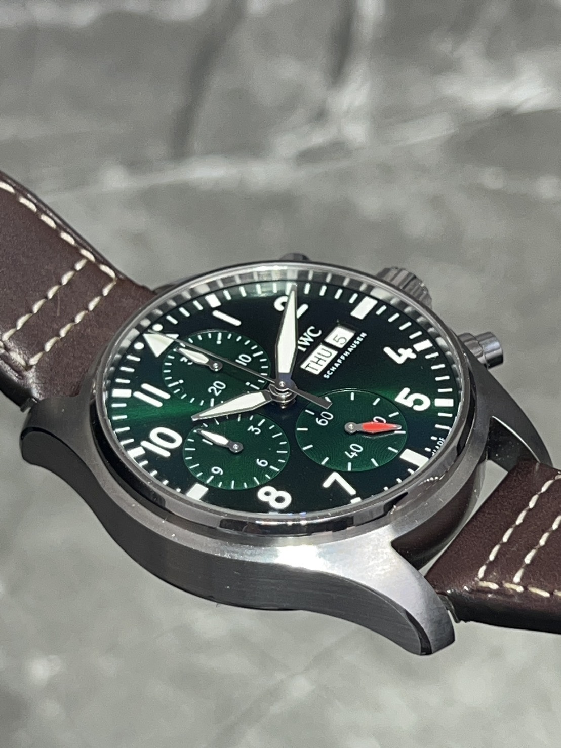 深みのあるグリーンダイヤルは光の角度によって表情を変えるサンレイ仕上げ。パイロットウォッチならではの大きなアラビア数字と三角形の12時インデックスが高い視認性を確保し、計器を思わせる端正なデザインが腕元に力強い存在感を与えます。