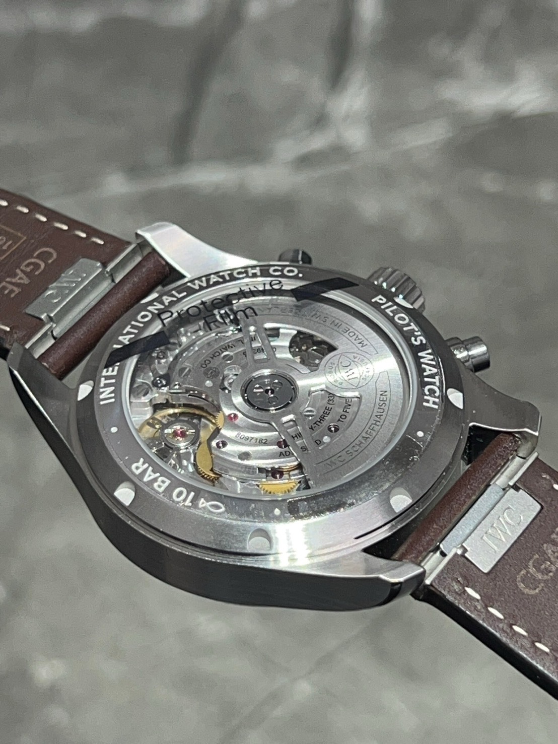 ムーブメントにはIWC自社製クロノグラフキャリバー Cal.69385 を搭載。コラムホイール式クロノグラフ機構を採用し、シースルーバックからは精緻に仕上げられたムーブメントの動きを楽しむ事ができます。