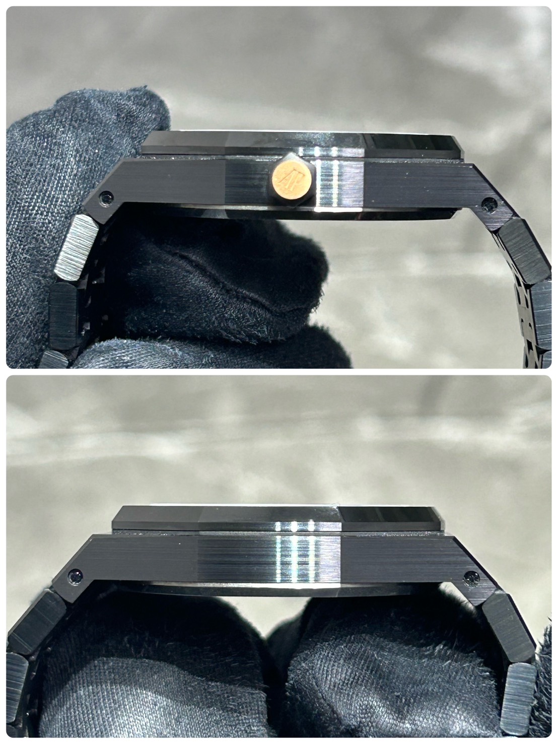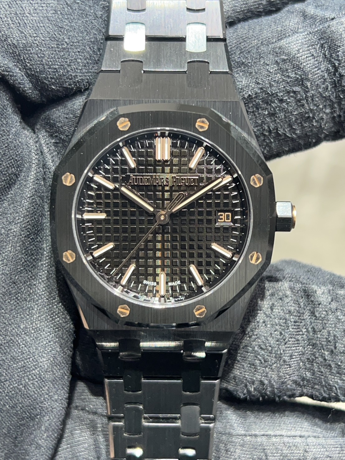 硬派になりすぎない温かみのある輝きが黒のロイヤルオークにセクシーで上品な色気を加えています。