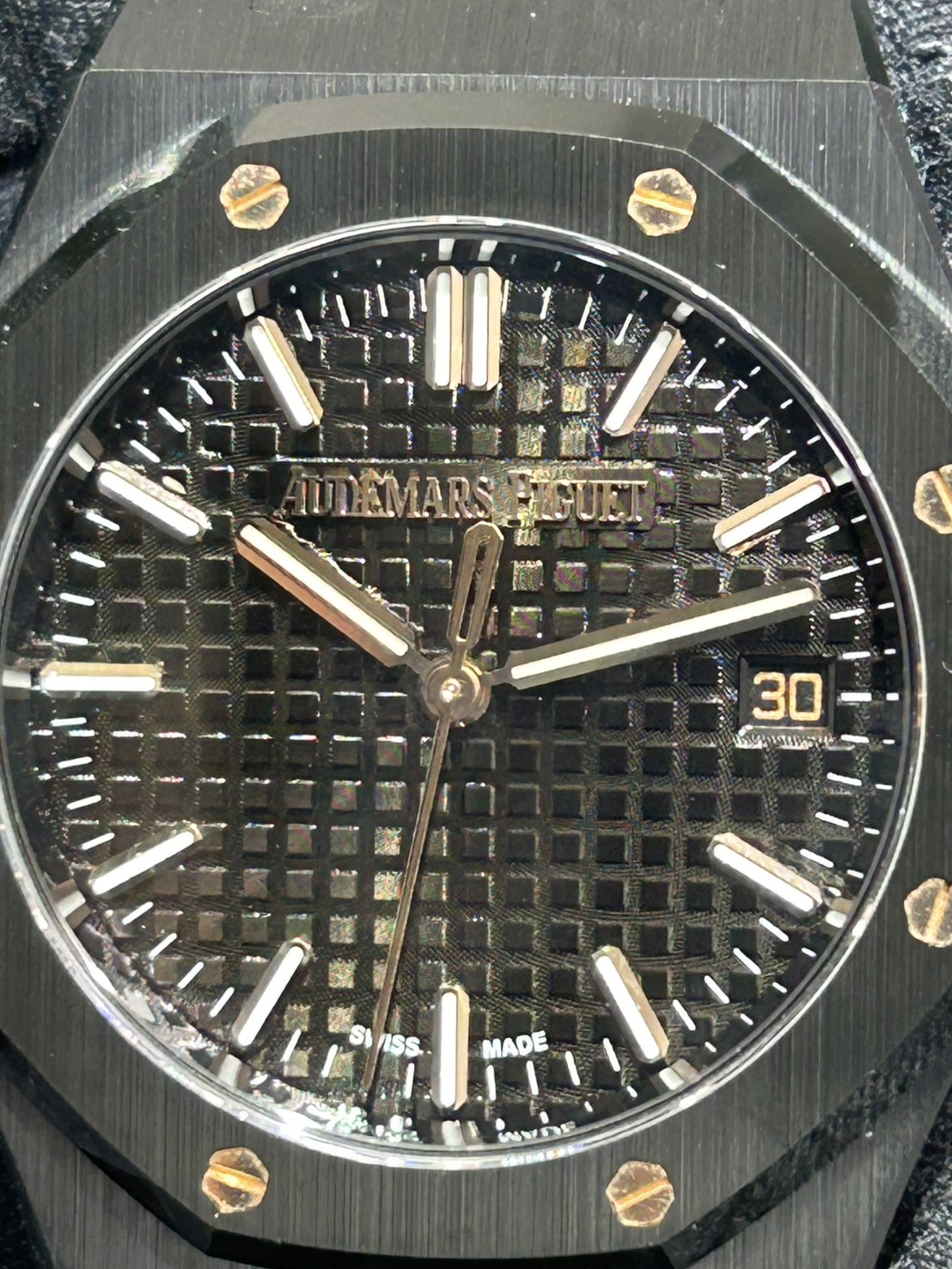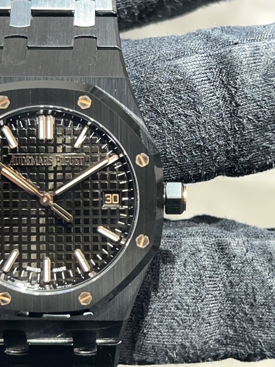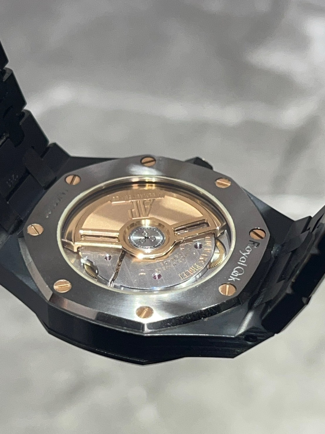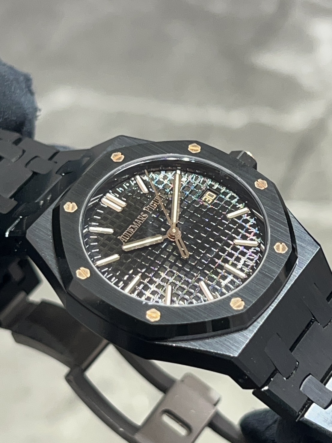 光沢のあるブラックセラミックに温かみのあるピンクゴールドのアクセントが映える34㎜のロイヤルオークです。