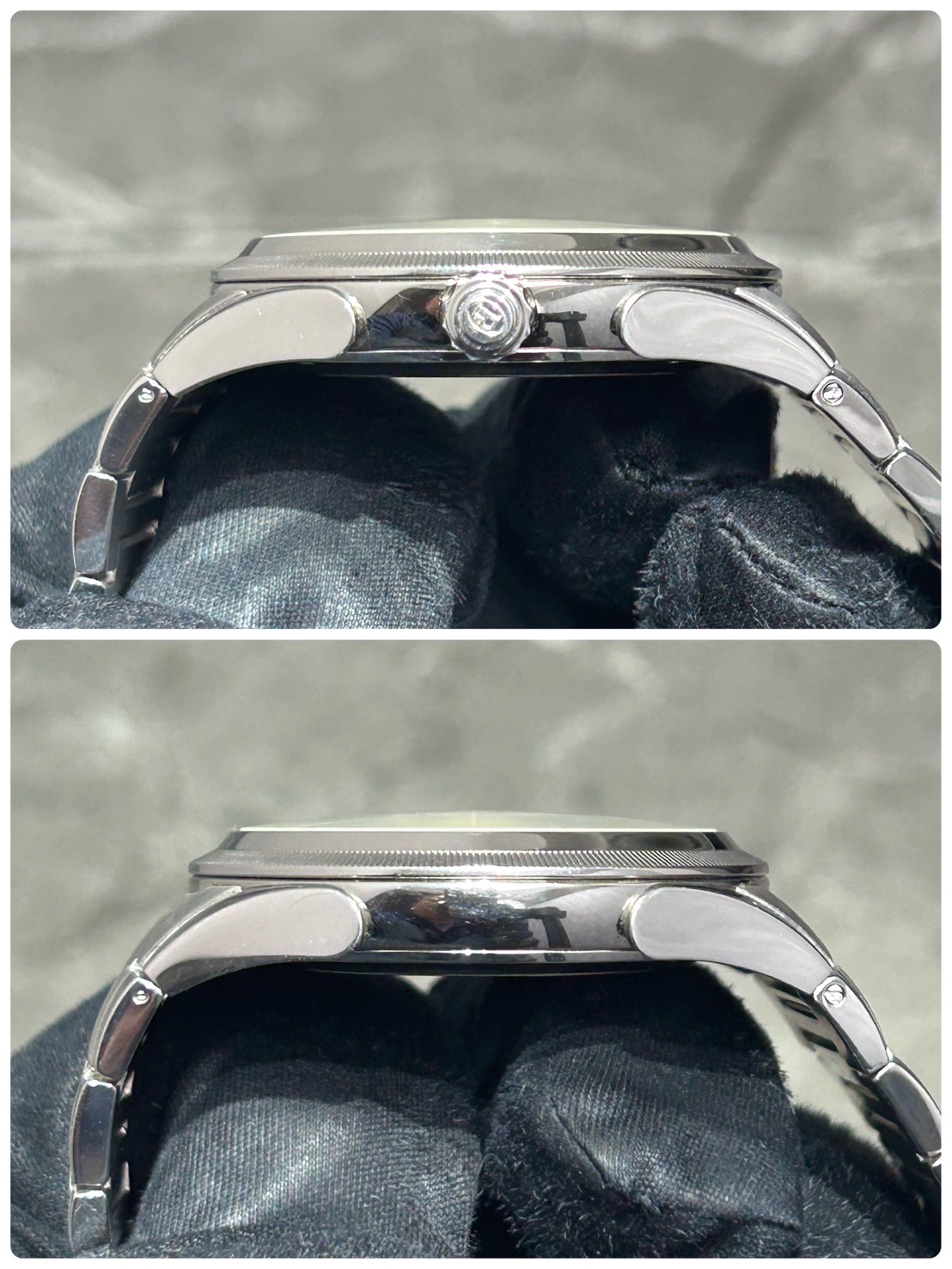 推しポイントとして繊細なローレット加工の施されたベゼルの光の移動が美しく立体的なラグは手首になじみ軽やかな着用感となっております。