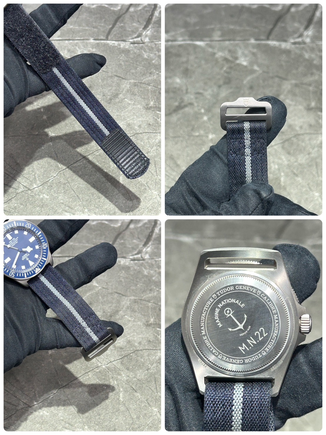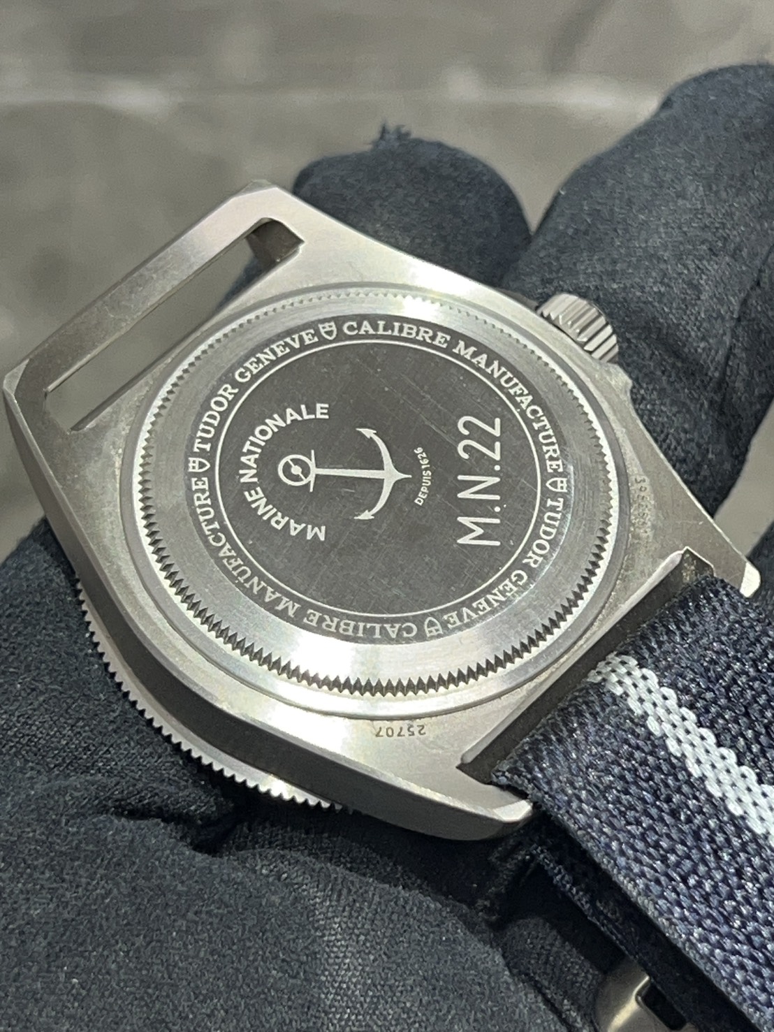 推しポイントとしてケースはチタン製になるため、軽量、耐傷性に優れ、マットな見た目で力強い印象を受けバックにはフランス海軍Marine nationaleのロゴが刻印されております。