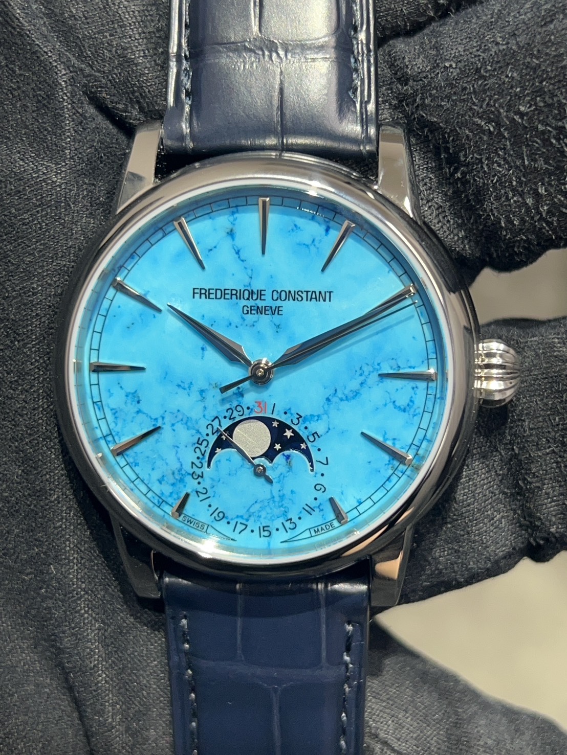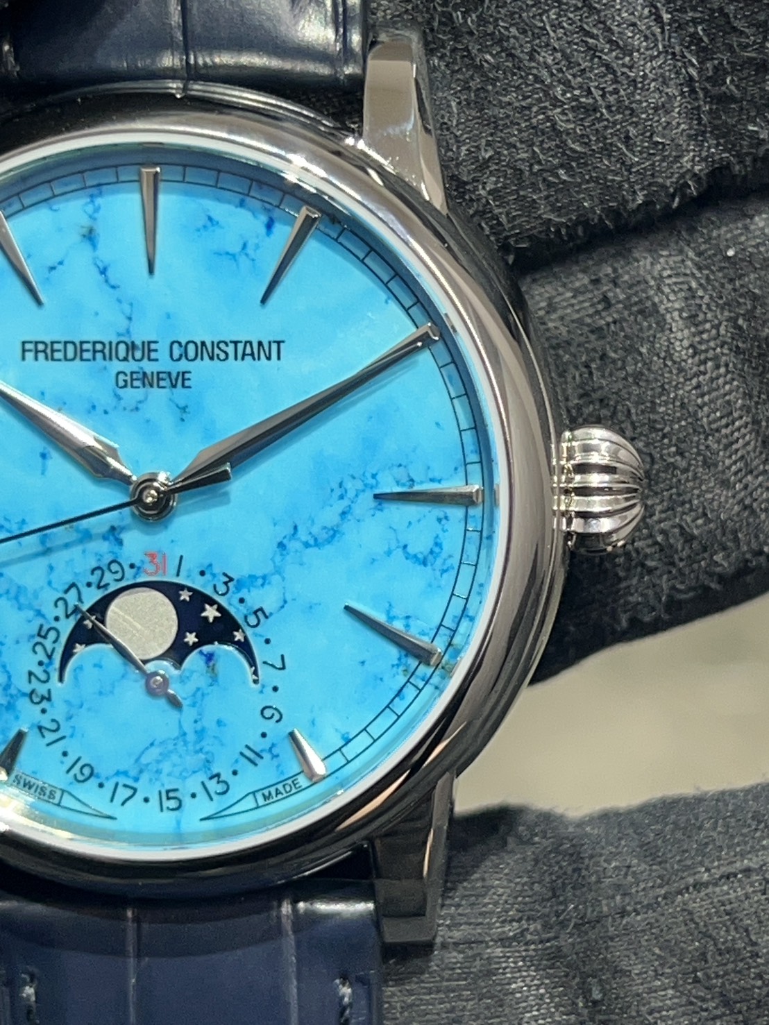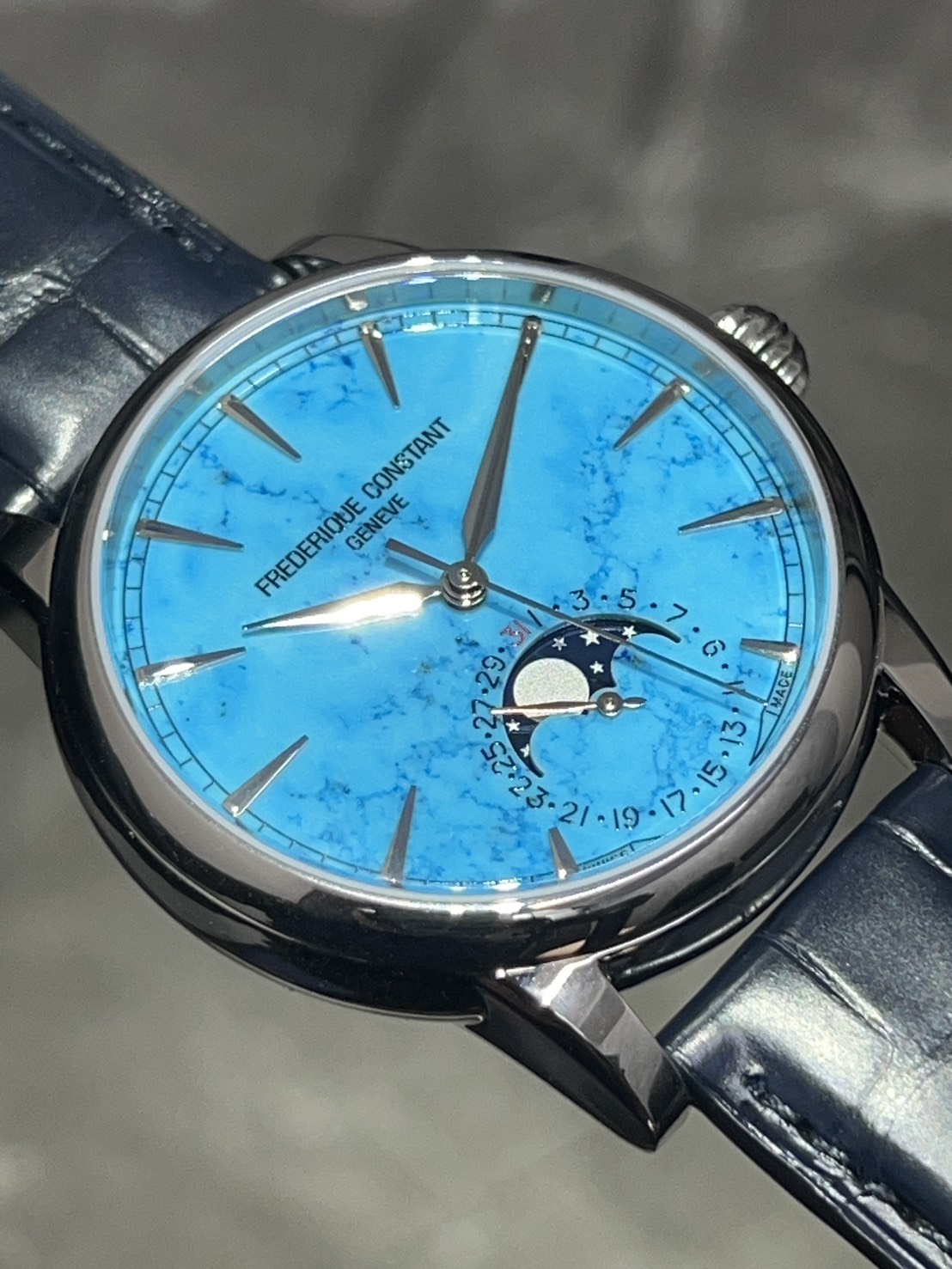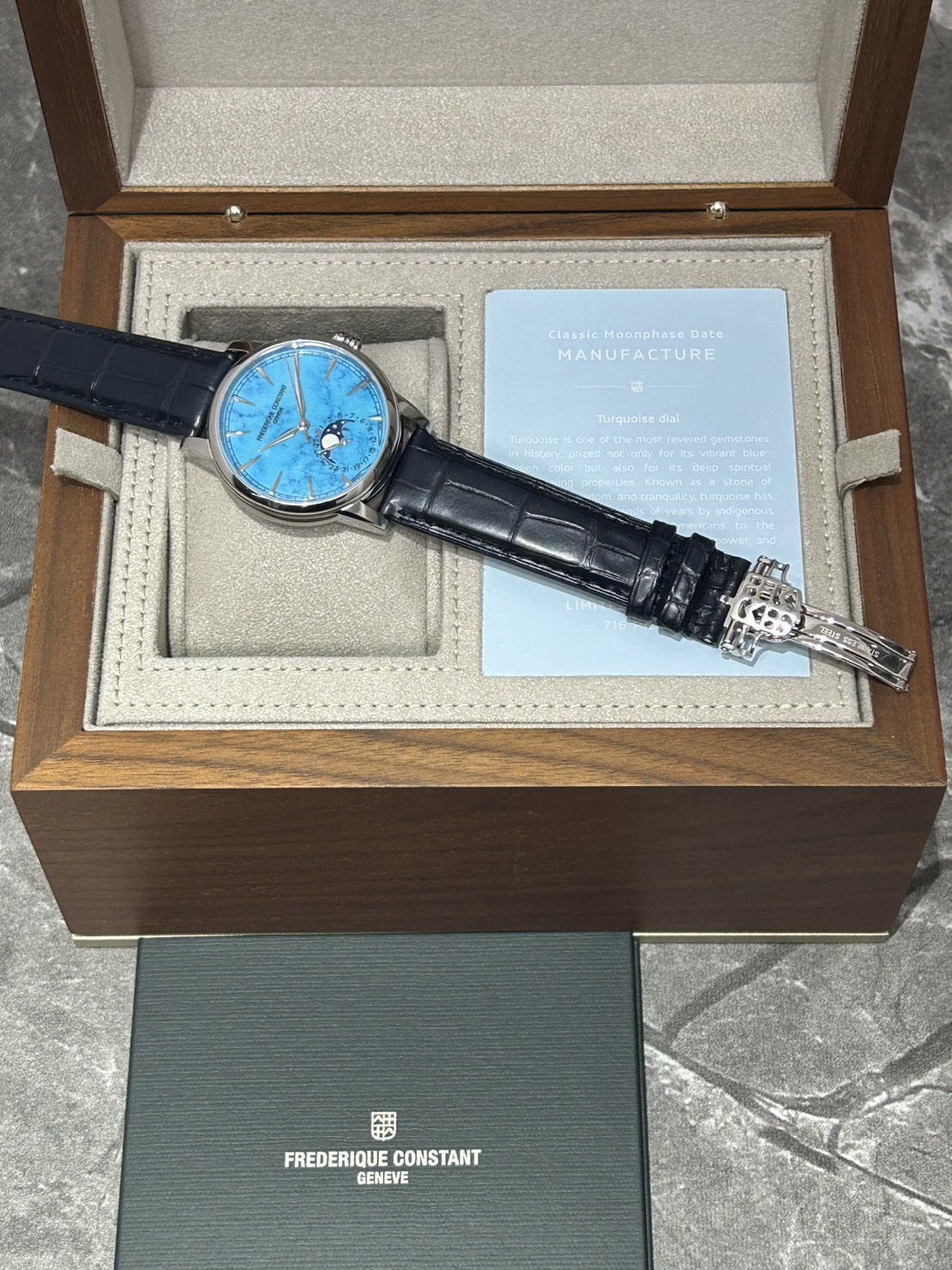 ターコイズ石ダイアルとムーンフェイズが織りなす神秘的なモデル、今回は716本限定のターコイズ クラシックムーンフェイズ デイト マニュファクチュールが入荷致しました。
