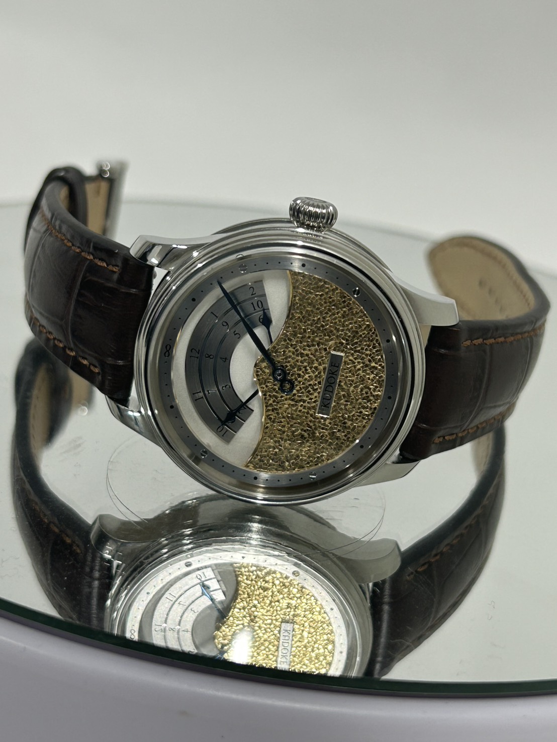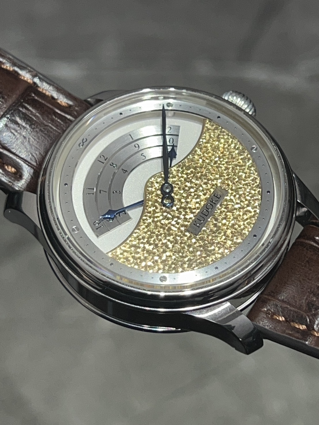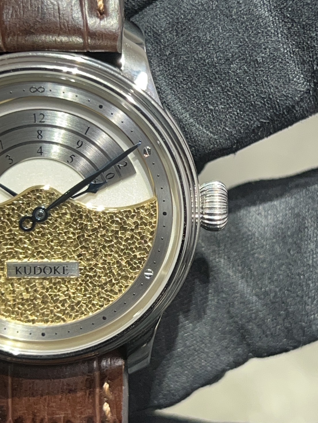 今回入荷したKUDOKE3は量産時計とは一線を画す、純粋な工芸としての魅力を備えた一本となっており、ダイヤル下部に施された“Flakes”と呼ばれる手彫り装飾は、職人が一点ずつ表面を削り出すことで生まれ、同じ模様の物は存在しません。
