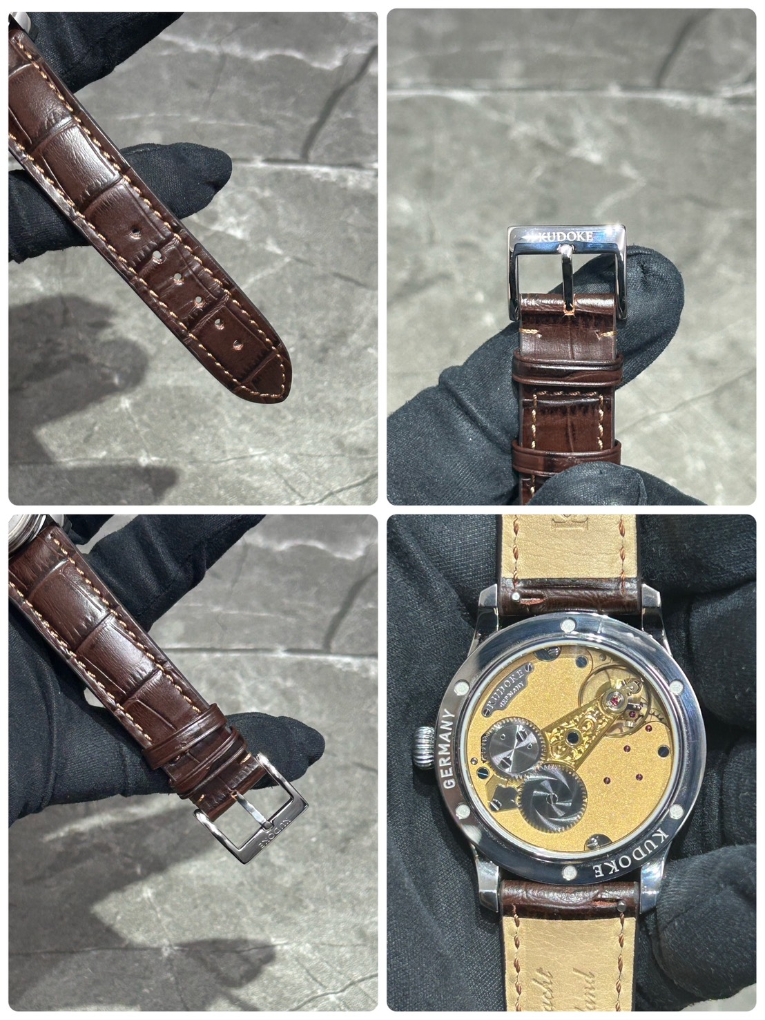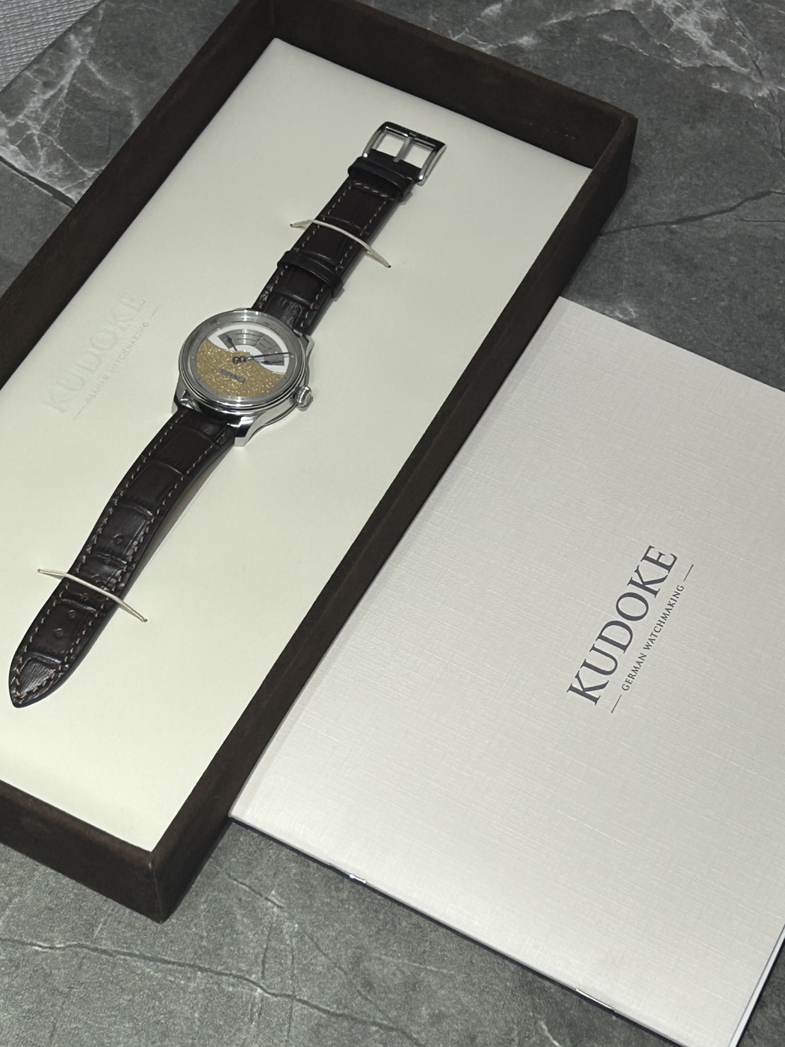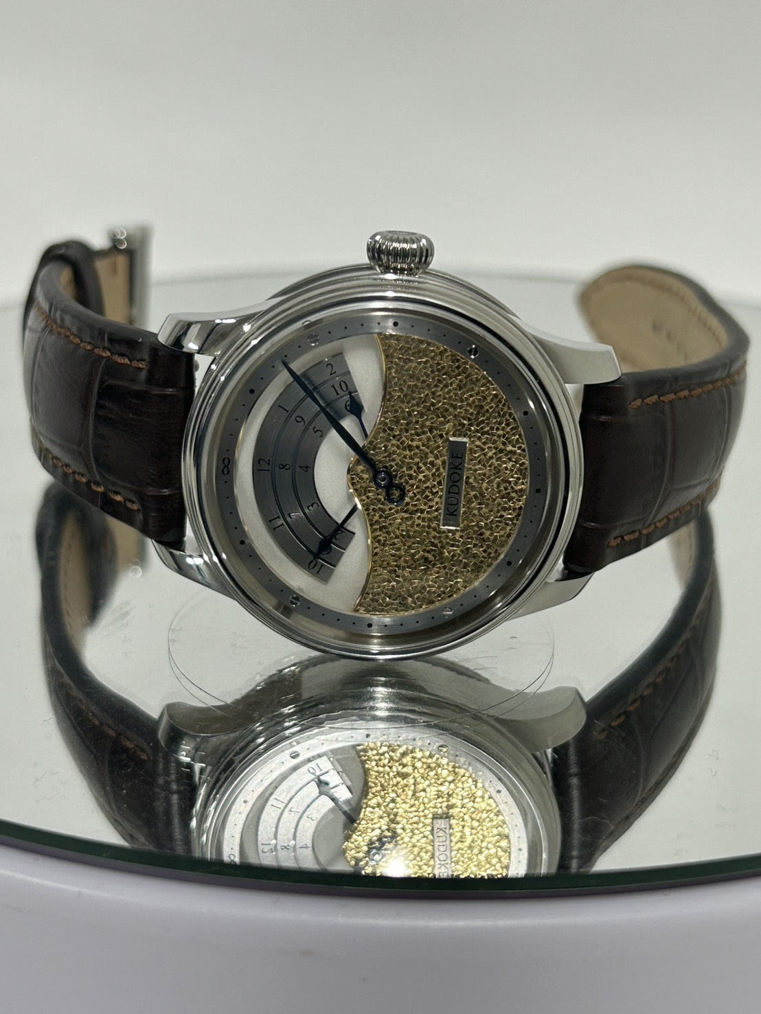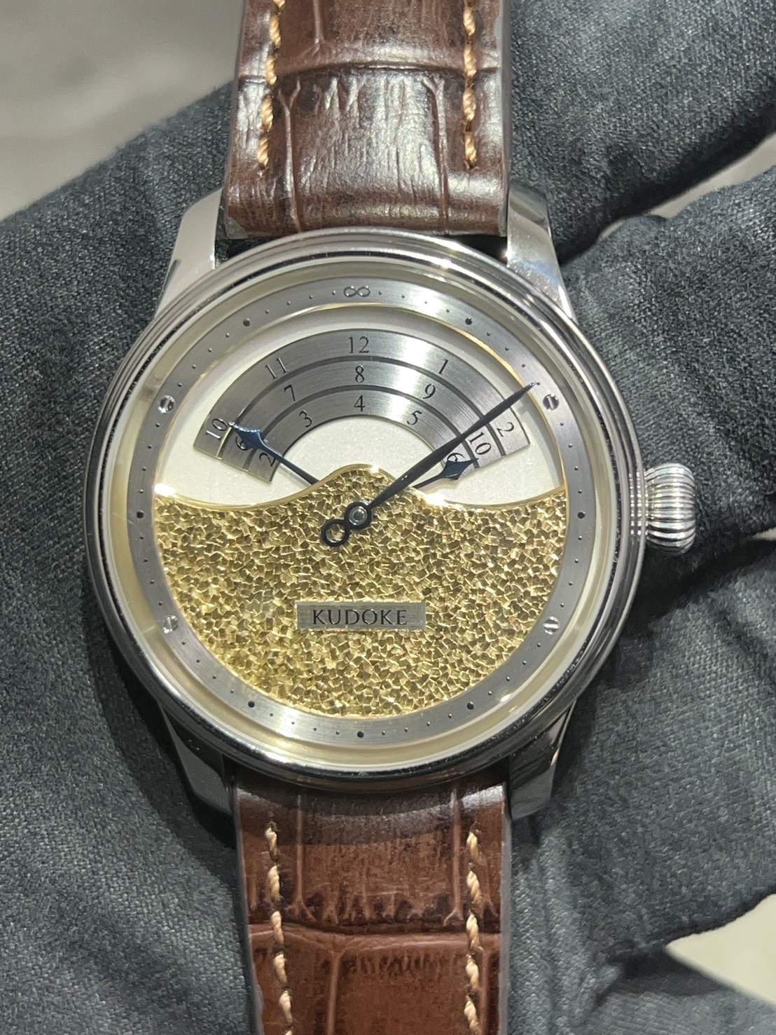 今回入荷したKUDOKE3は量産時計とは一線を画す、純粋な工芸としての魅力を備えた一本となっており、ダイヤル下部に施された“Flakes”と呼ばれる手彫り装飾は、職人が一点ずつ表面を削り出すことで生まれ、同じ模様の物は存在しません。