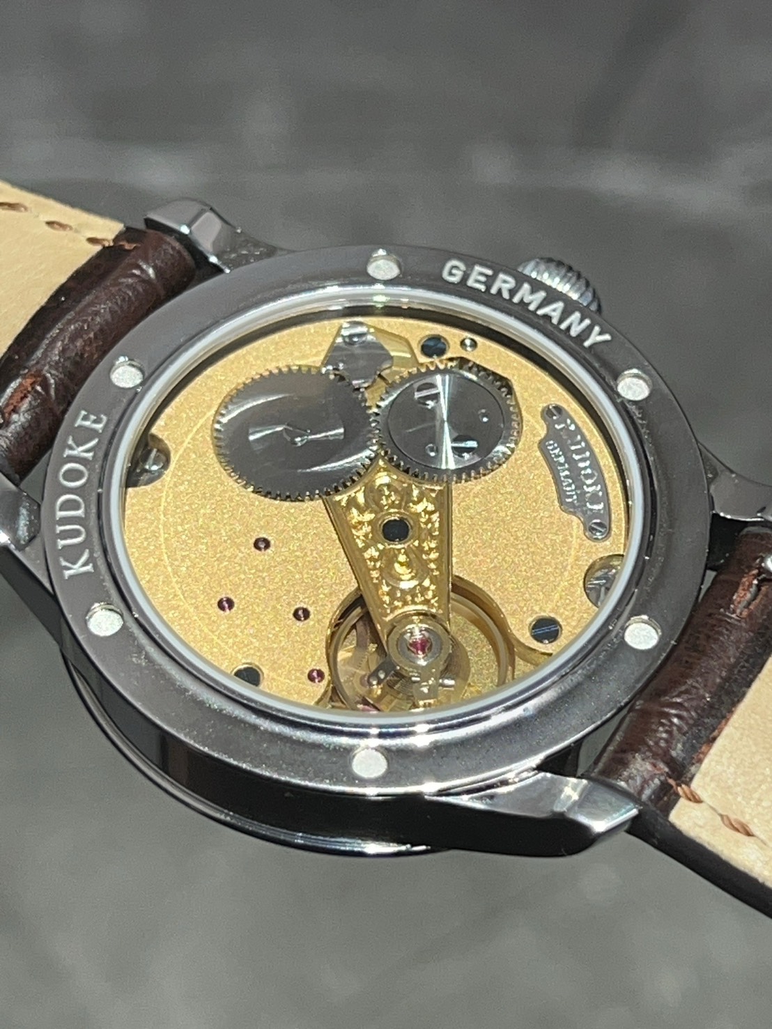 裏蓋からは自社製キャリバーを鑑賞する事ができ、フロスト仕上げや手彫り装飾が丁寧に施された美しい仕上がりとなっております。