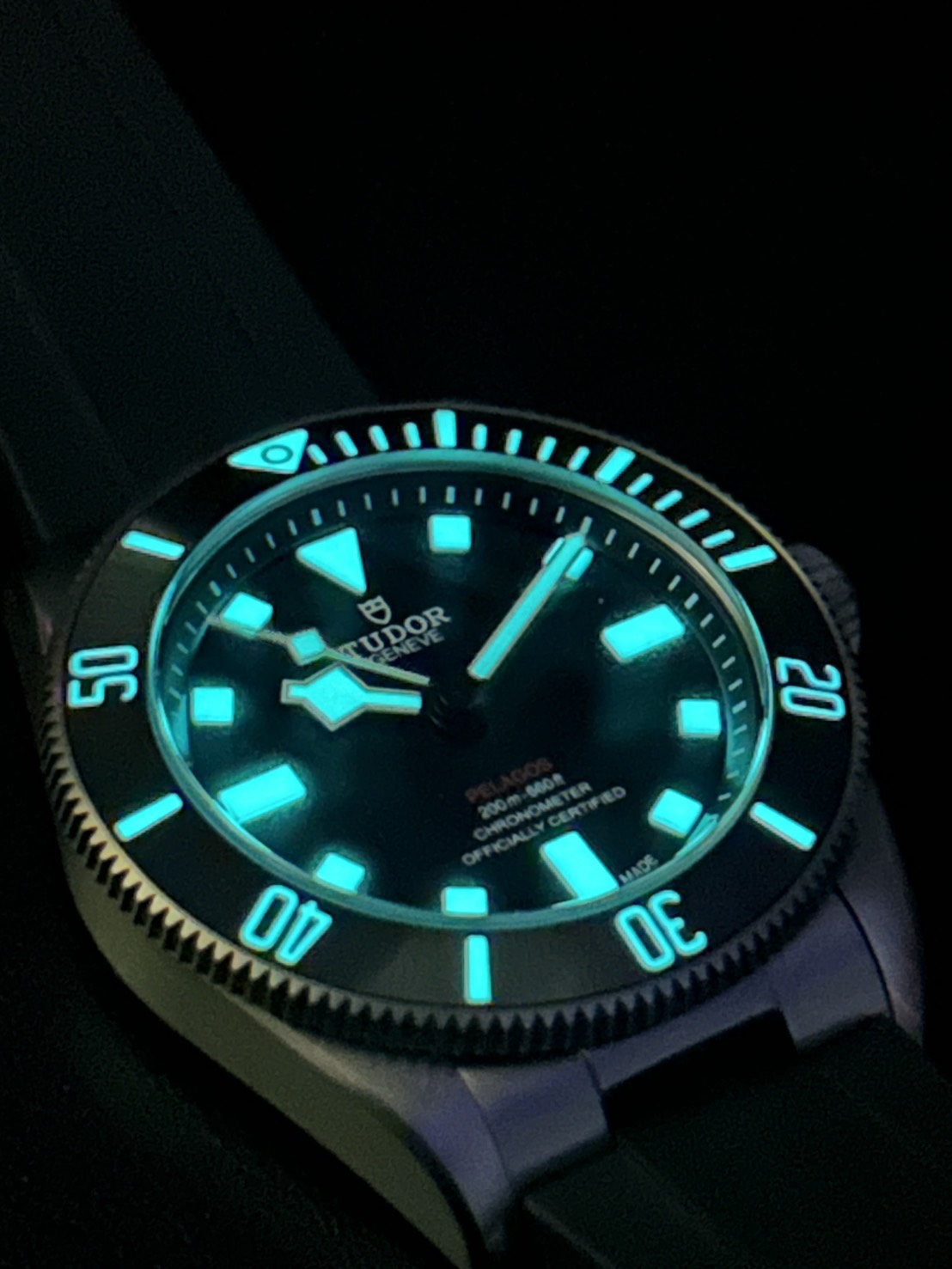 ベゼルにも夜光塗料が塗られてますので夜間でも非常に視認性がよくどのようなシーンでも使いやすい万能時計と存じます。