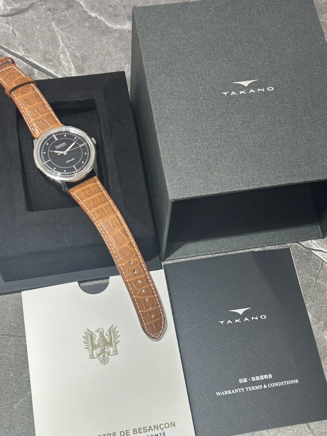 1、本体 2、ストラップ(使用感僅少) 3、ピンバックル(スレなし) 4、保証書 5、ブザンソン天文台精度規格証明書 6、内外箱
