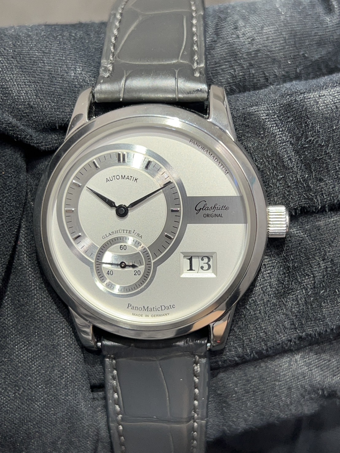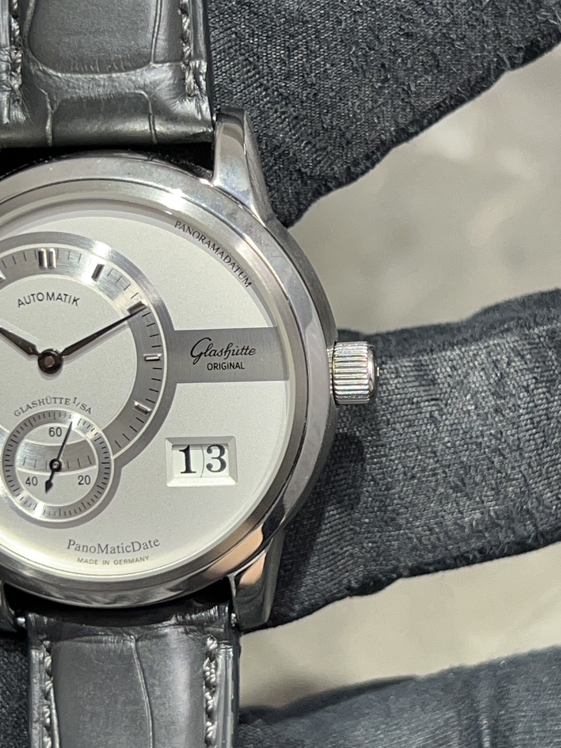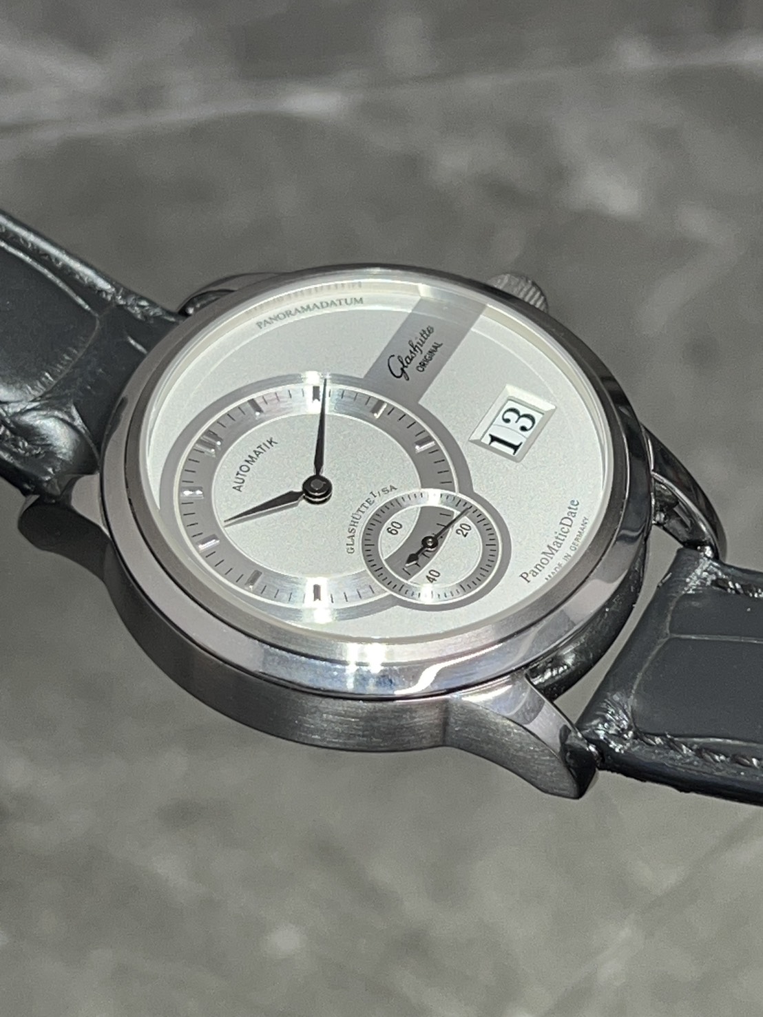 Glashütte Originalの人気コレクション「Pano」シリーズのひとつで、オフセンター(非対称)ダイヤルとビッグデイトが特徴的なクラシックかつ洗練されたデザインのパノマティック デイトが入荷致しました。