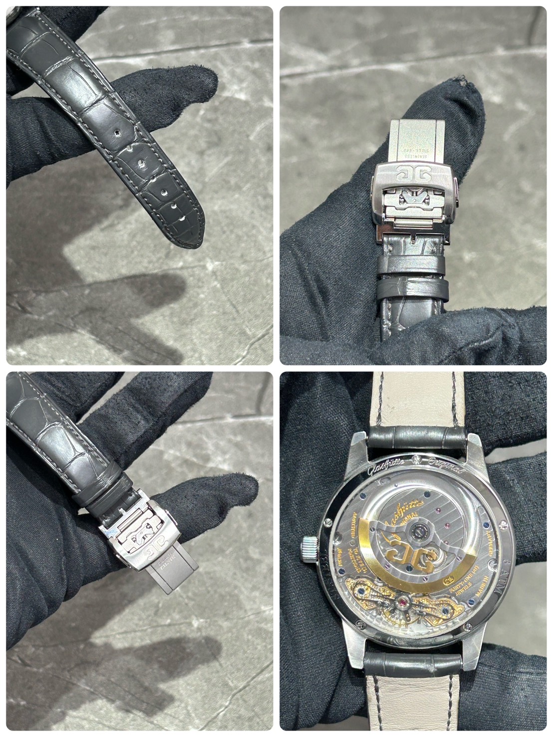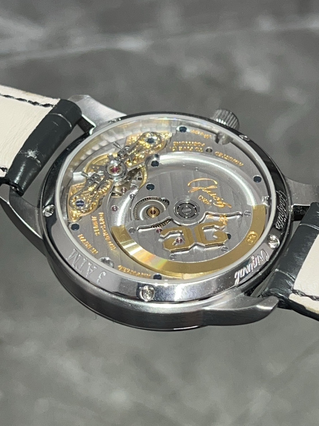 裏蓋からは 自社製Cal.90-01ムーブメントの3/4プレート、ダブルスワンネック調速機(手彫り)、グリシン仕上げ、ブルースクリューなど、伝統的なドイツ時計の装飾が存分に堪能できます。